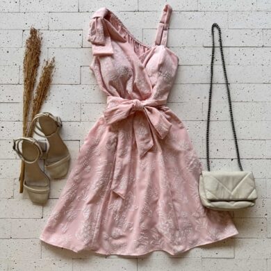 VESTIDO BORDADO LAÇO NO OMBRO E AMARRAÇÃO FIXA ROSA CLARO