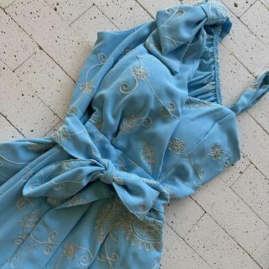 VESTIDO LONGO BORDADO ALCINHA E AMARRAÇÃO FIXA AZUL CARO