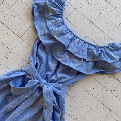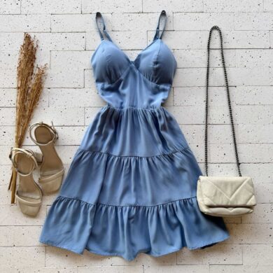 VESTIDO DECOTE TRANSPASSADO ALÇA BABADOS E AMARRAÇÃO AZUL