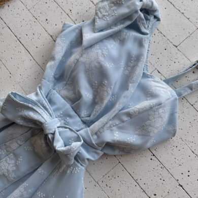 VESTIDO LONGO BORDADO LAÇO NO OMBRO E AMARRAÇÃO FIXA AZUL CLARO