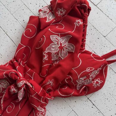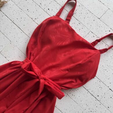VESTIDO LONGUETE ACETINADO COM GOLA LENÇO VERMELHO