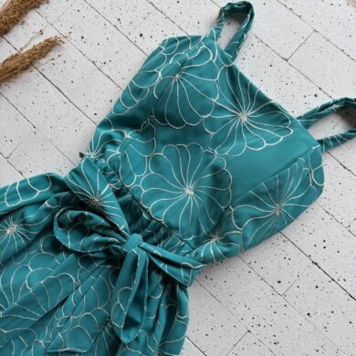 VESTIDO LONGO BORDADO LUREX CAMADAS E CINTO FAIXA TURQUESA