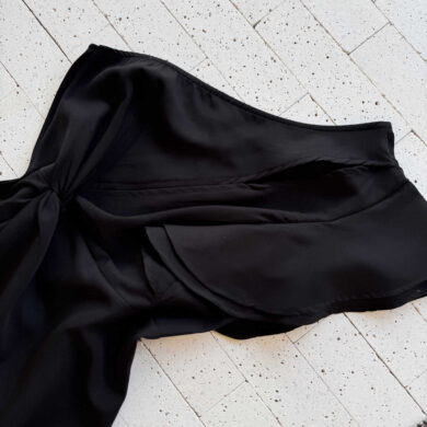 VESTIDO MIDI UM OMBRO SÓ BABADOS E FENDA PRETO