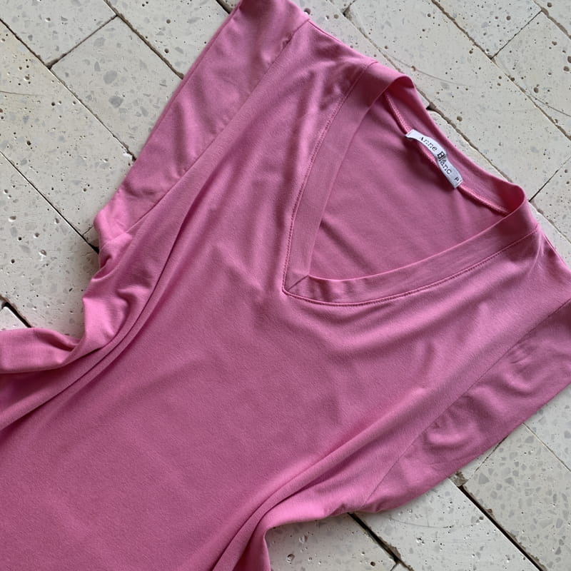 Adquira a Blusa Lisa Sem Manga Decote V Rosa na Dondoca!