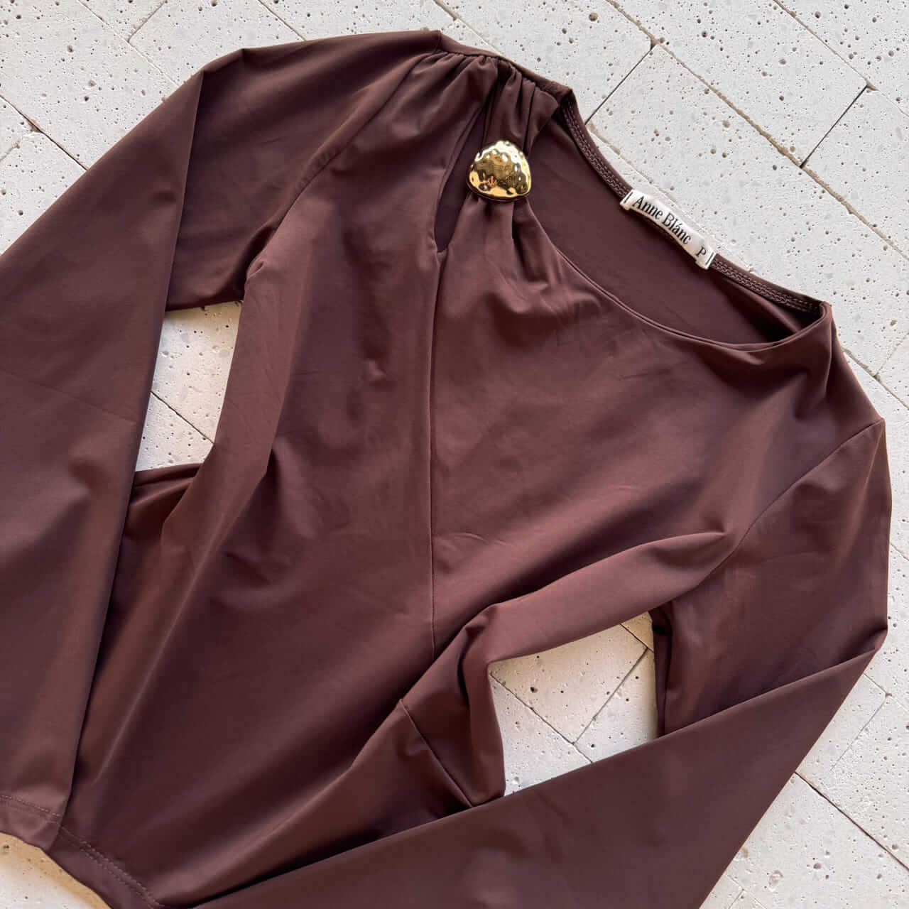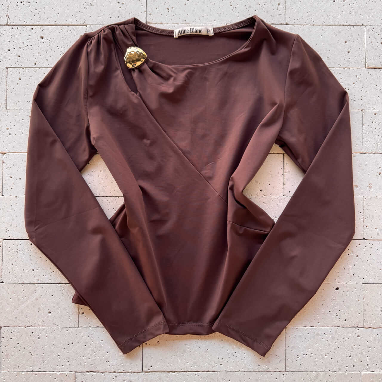 BLUSA MANGA LONGA COM ABERTURA E FIVELA NO OMBRO CAFÉ – Sofisticação Terrosa com Detalhe Marcante