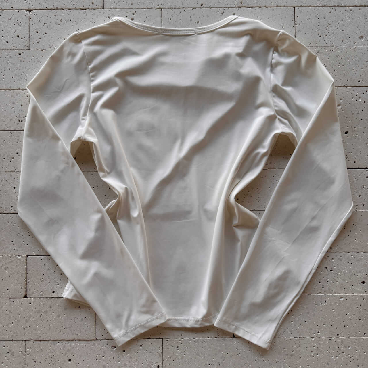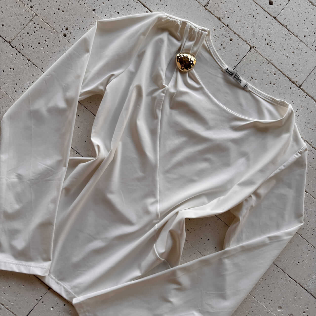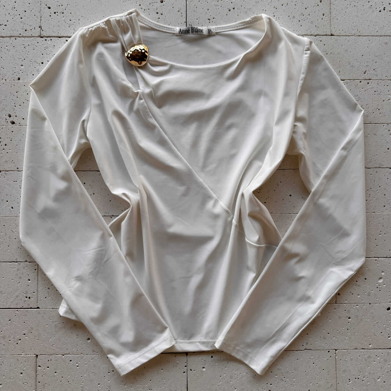 BLUSA MANGA LONGA COM ABERTURA E FIVELA NO OMBRO OFF – Delicadeza Sofisticada com Toque Moderno
