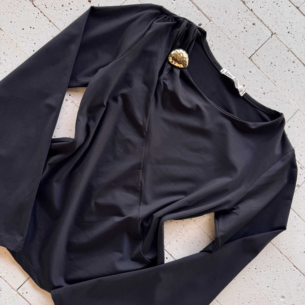 BLUSA MANGA LONGA COM ABERTURA E FIVELA NO OMBRO PRETA – Elegância Moderna com Detalhe Sofisticado