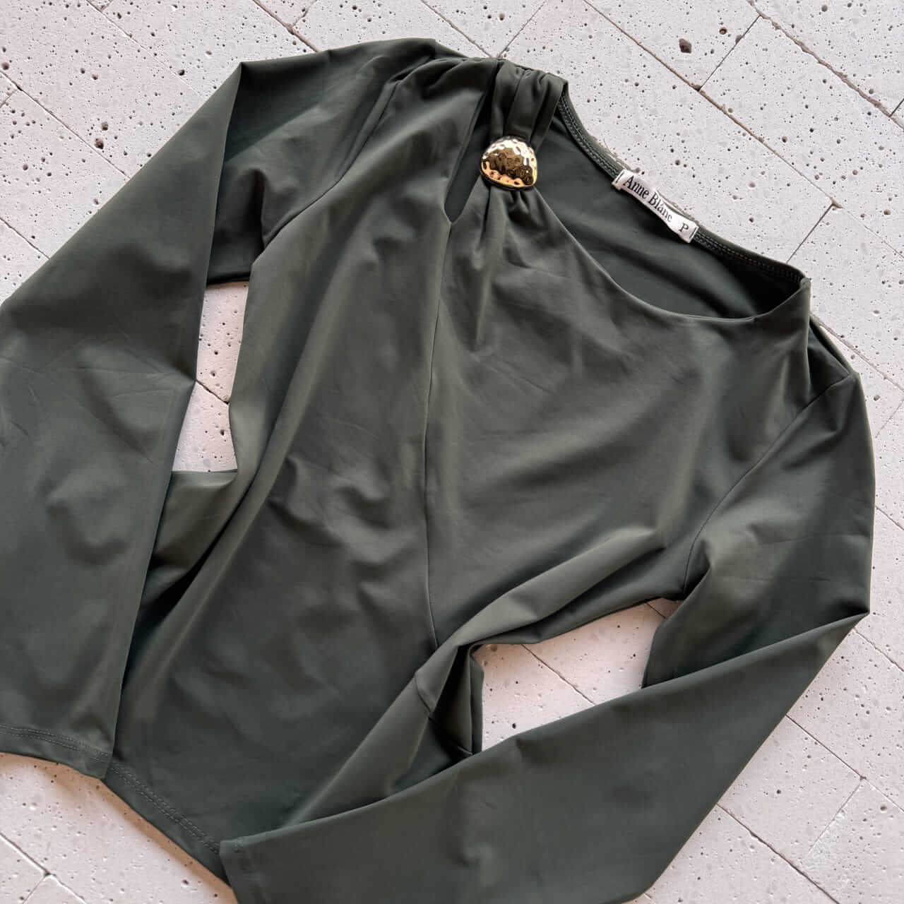 BLUSA MANGA LONGA COM ABERTURA E FIVELA NO OMBRO VERDE OLIVA – Elegância Contemporânea com Toque Fashion