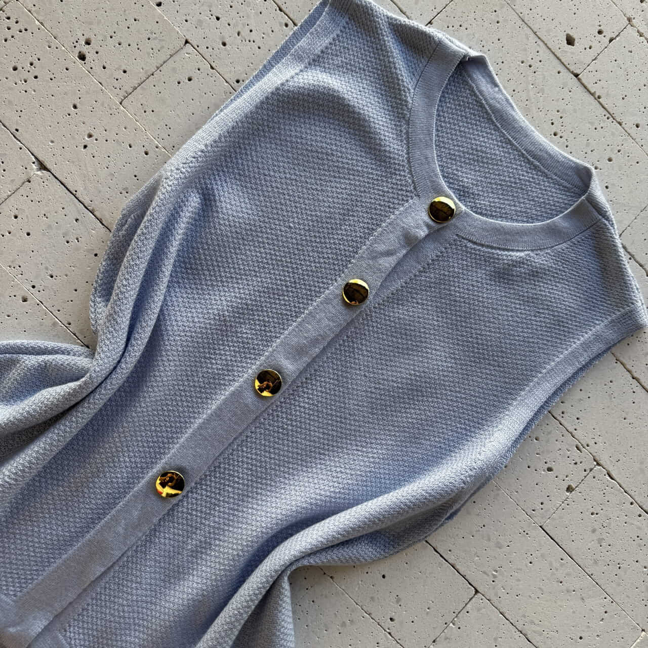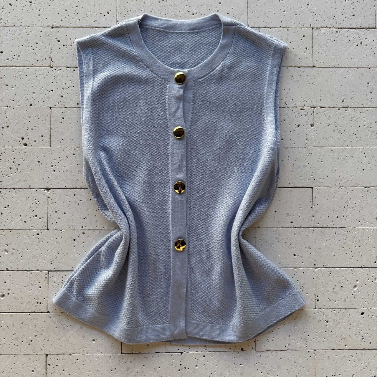 A Blusa Modal Detalhe Botões Azul Claro combina sofisticação e conforto em uma peça versátil e delicada. Seu design sem mangas valoriza o colo e os ombros, enquanto os botões dourados frontais trazem um charme extra e um toque moderno. O tecido de modal com trama texturizada oferece um caimento leve, ajustando-se ao corpo com elegância e garantindo conforto em todas as ocasiões.