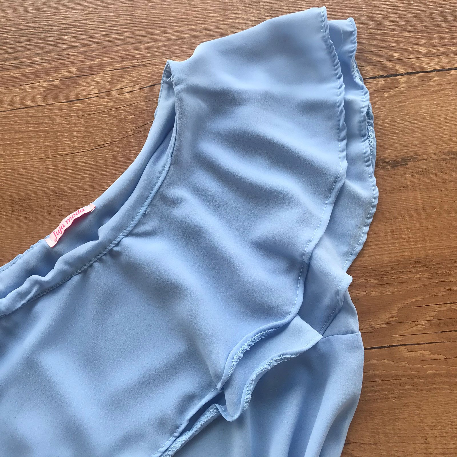 - Detalhes em babados duplos no decote;