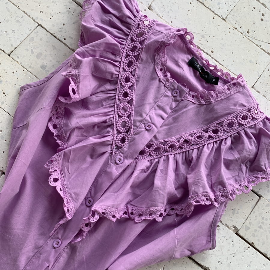 Como usar sua Blusa sem Decote Detalhes Babados e Gripier Lavanda