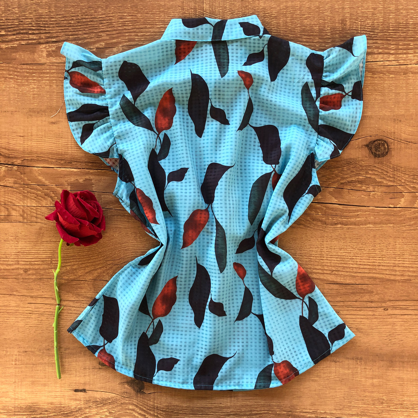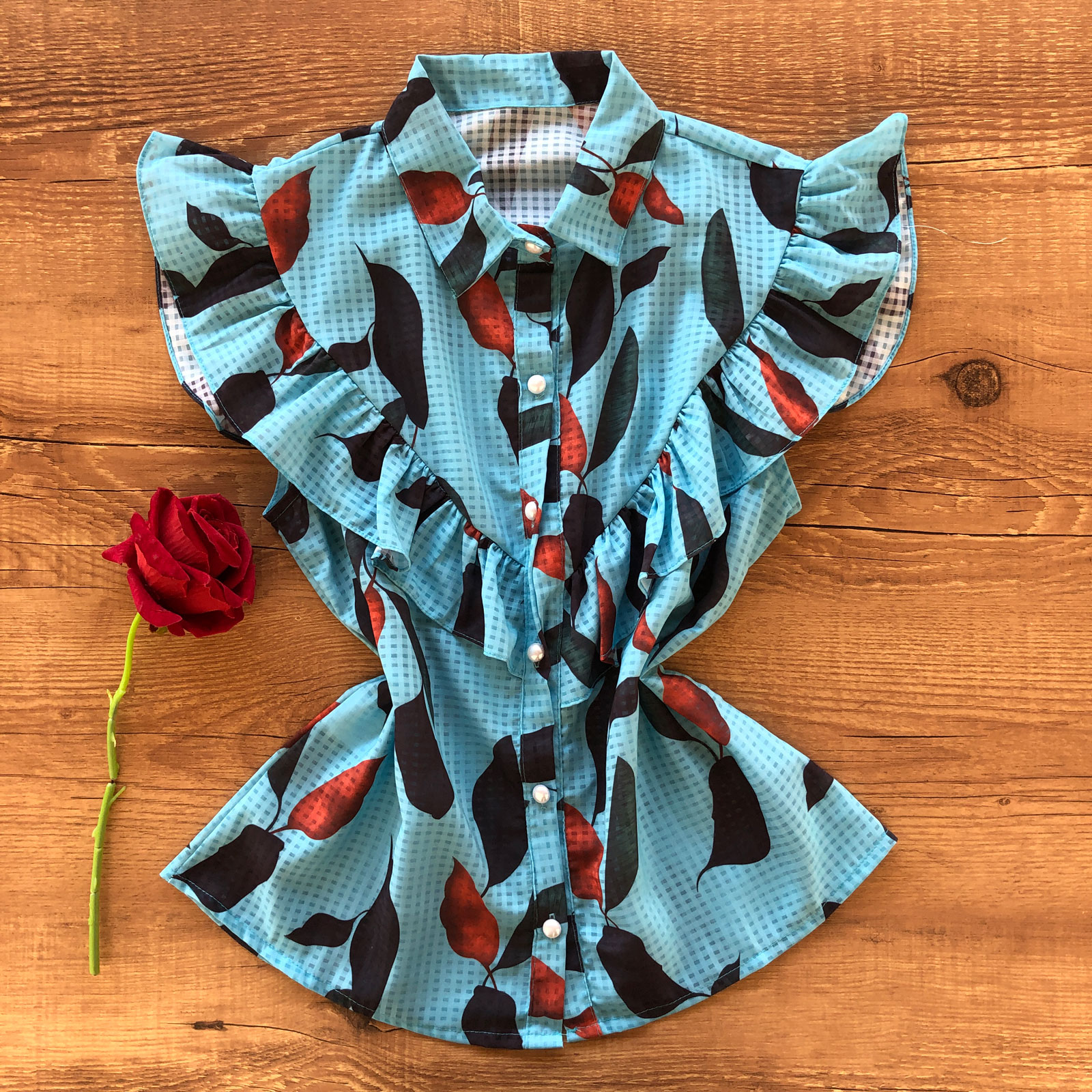 Escolha sua Blusa Transparência Estampada Com Babados Azul com nosso PROVADOR VIRTUAL