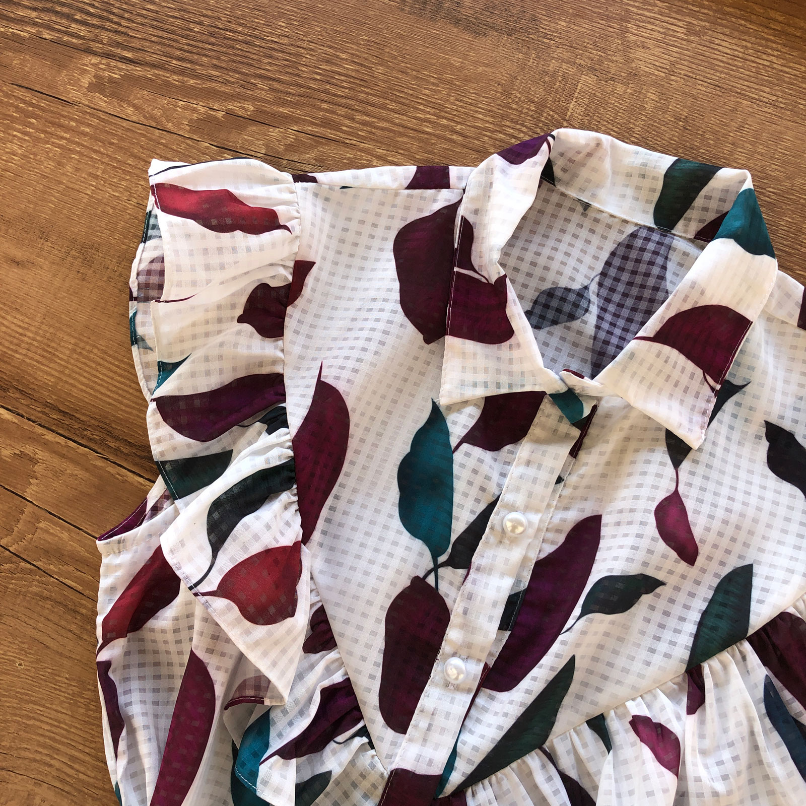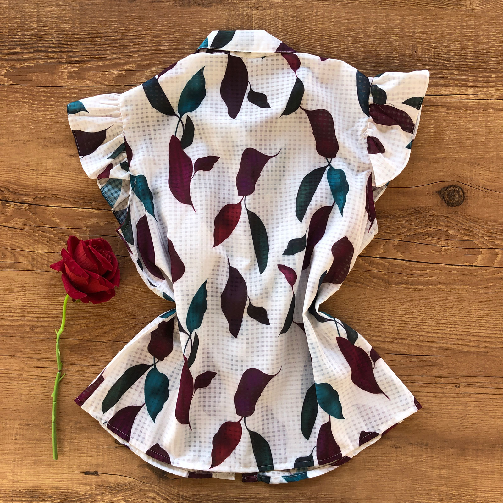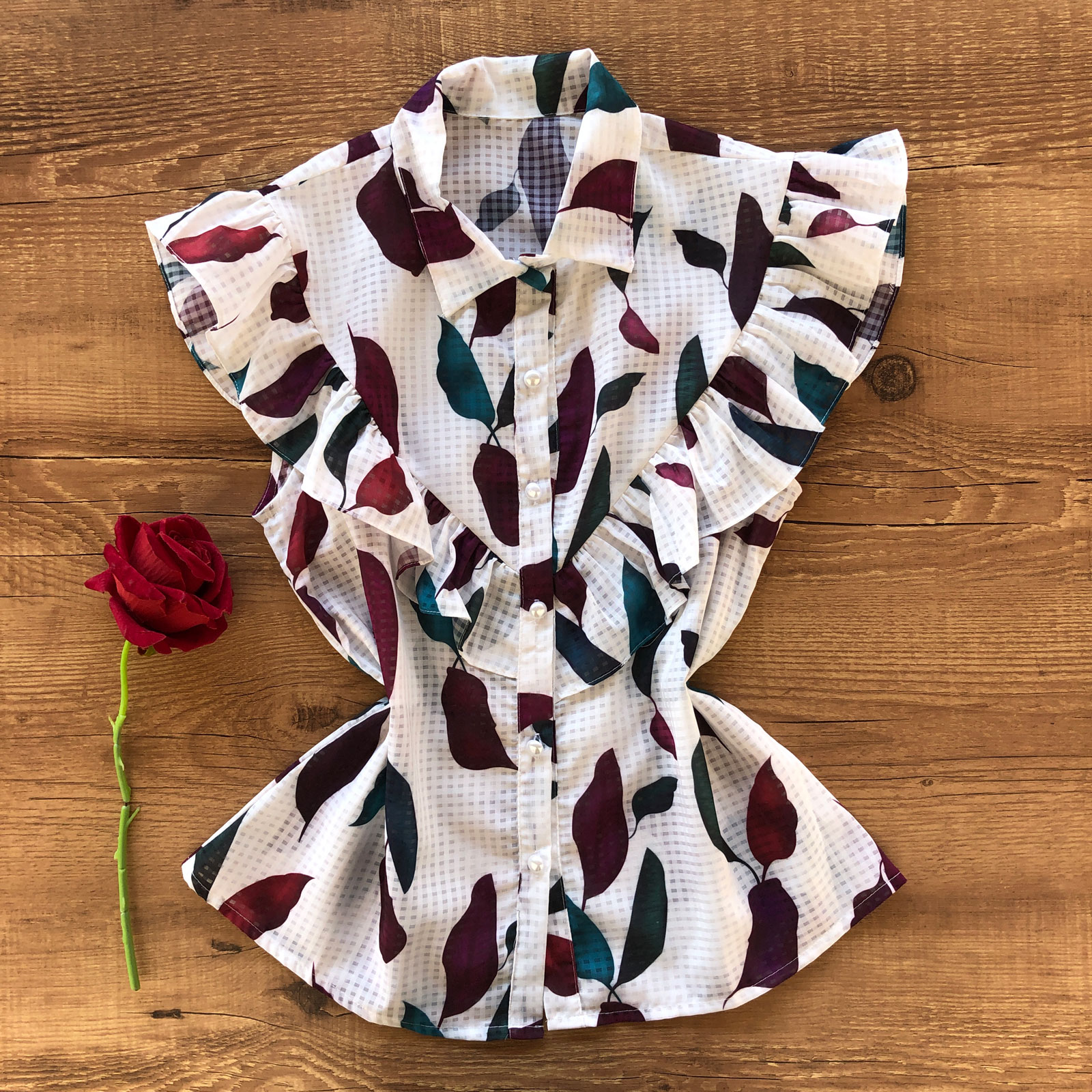 Escolha sua Blusa Transparência Estampada Com Babados OFF com nosso PROVADOR VIRTUAL