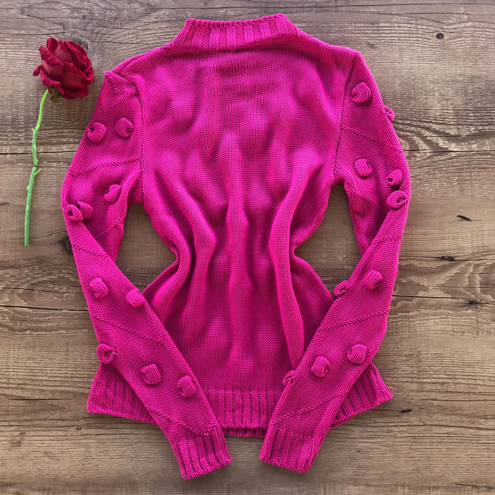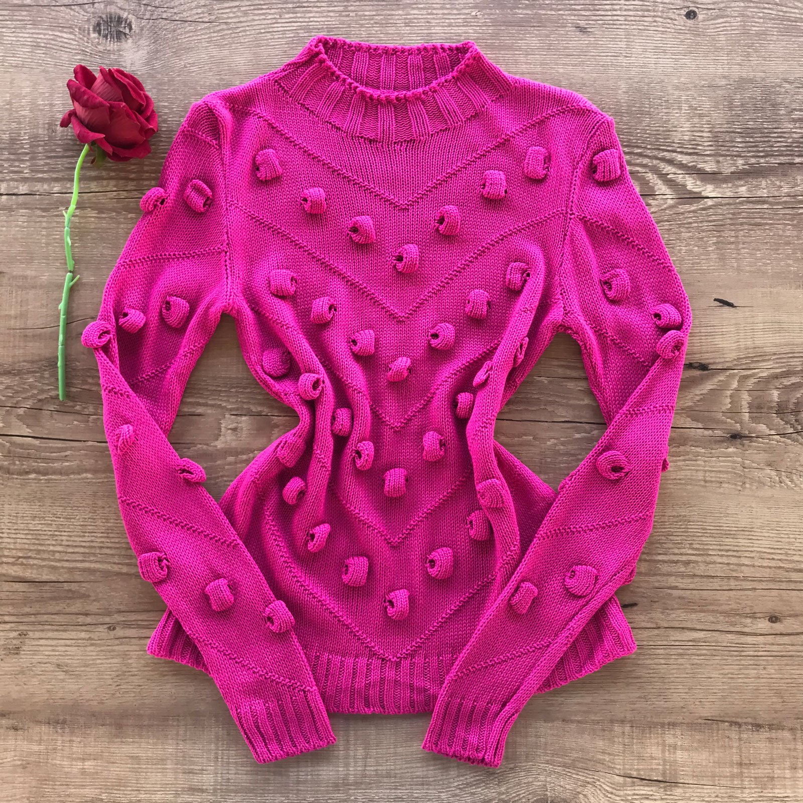 Como usar sua Blusa Tricô Gola Alta Bolhas Detalhes Em V Rosa Chiclete