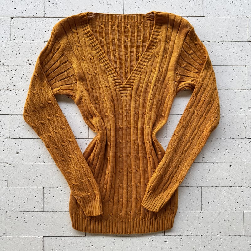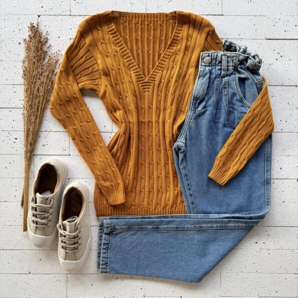 BLUSA TRICO GOLA V TRAMA CANELADA MOSTARDA – Elegância em Tom Quente