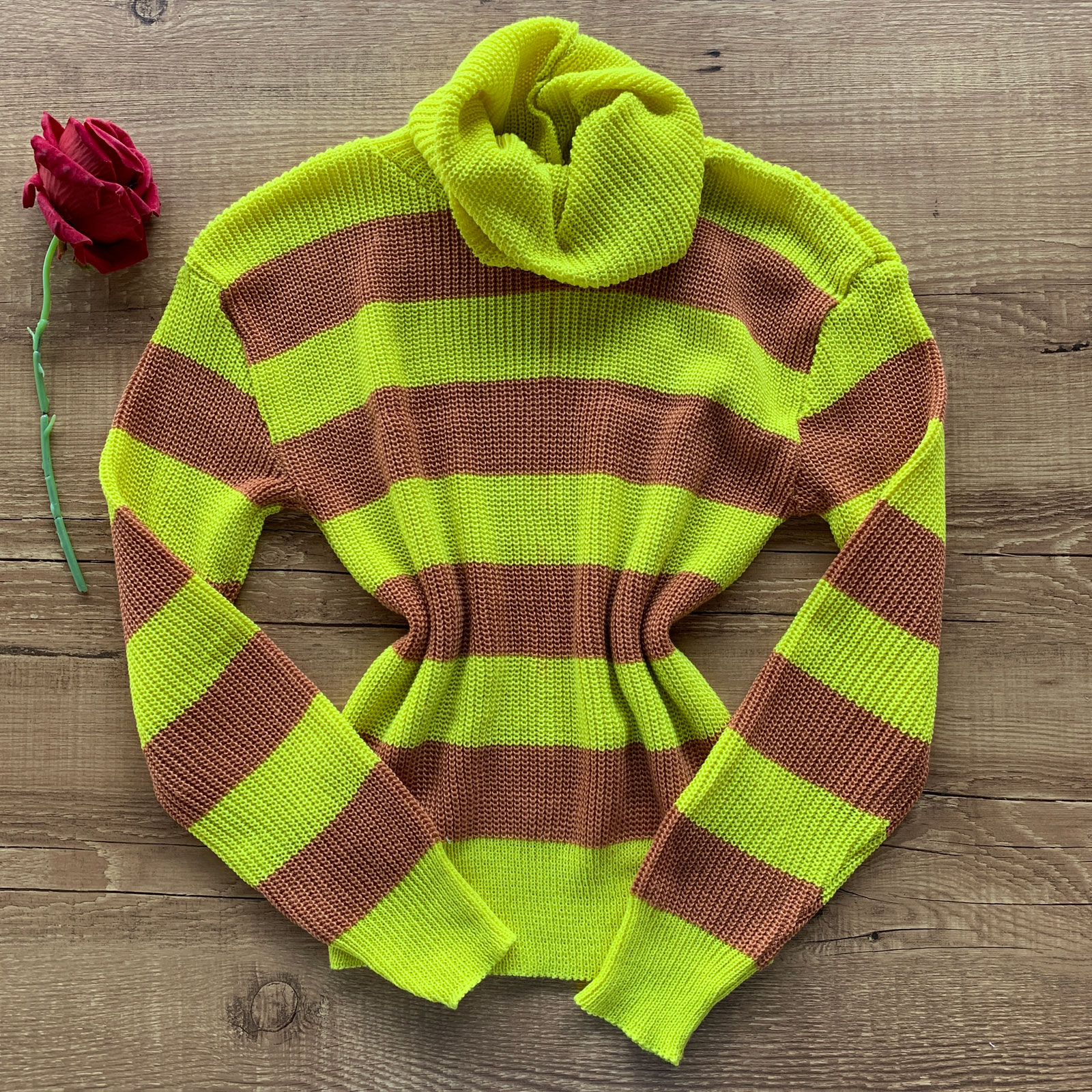 A Blusa Trico Listrado Gola Boba Lima e Caramelo é a peça essencial para esta nova temporada e você vai amar combinar as listras! O trico, já bastante conhecido na evolução da moda é confortável, com alta capacidade de duração e resistência, possui tramas equilibradas sendo uma ótima opção à ser usada no outono/inverno. A modelagem harmoniza no corpo e as listras trazem sensação de movimento, além de valorizar as curvas da silhueta. Apresenta gola alta tipo boba que deixa em evidencia, parte do pescoço além de trazer um design inigualável. Contém mangas longas com detalhe de trama nos punhos que criam uma barreira em dias frios.