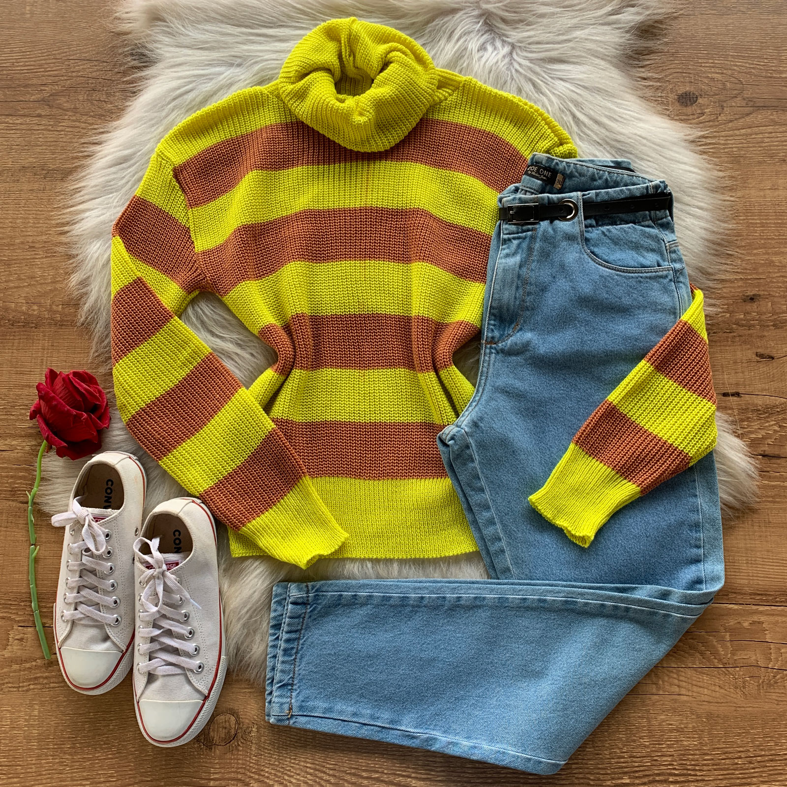 Como usar sua Blusa Trico Listrado Gola Boba Lima e Caramelo