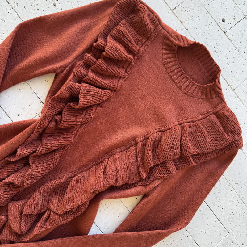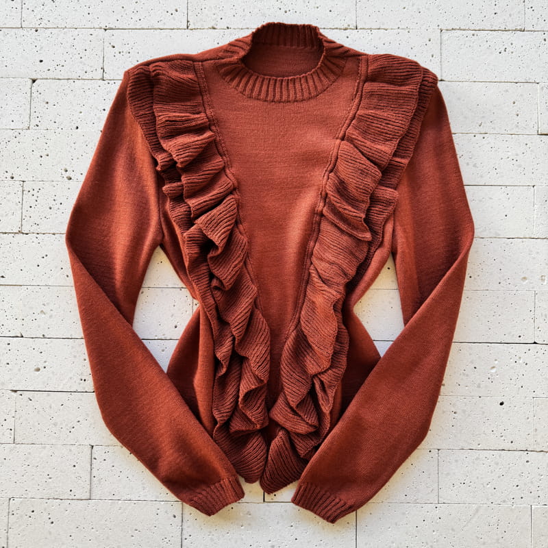 Garanta agora sua Blusa Tricô Modal com Babados Frontal Carmim com Envio Rápido e 12x sem juros!