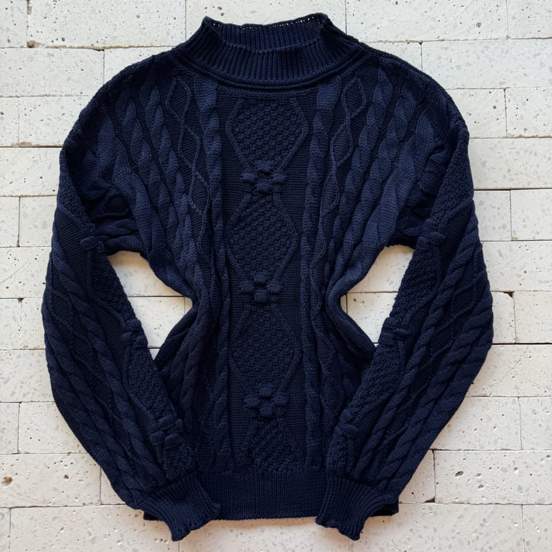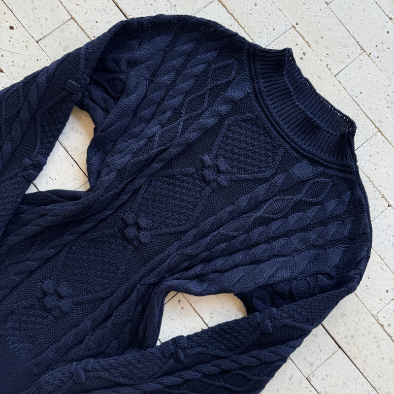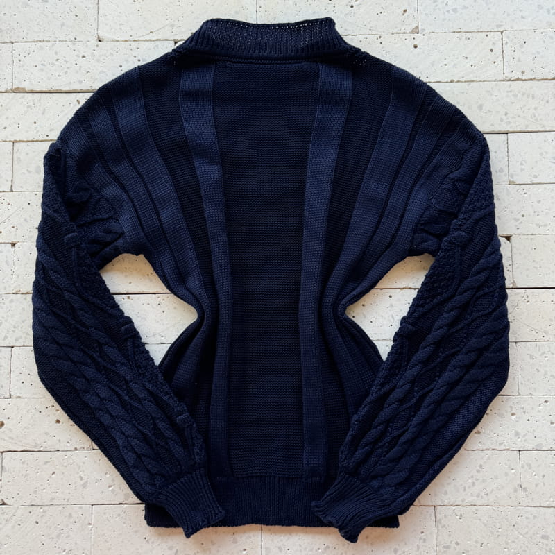 BLUSA TRICÔ TRAMA E BOLHAS MARINHO – Elegância Clássica em Trama Artesanal
