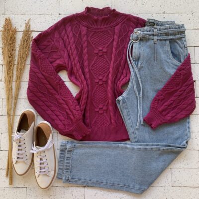 A blusa tricot magenta é a escolha ideal para os dias mais frescos com muito estilo. Sua modelagem ajustada ao corpo valoriza a silhueta, enquanto o mix de tramas e relevos desenhados no tricô cria um efeito visual elegante e sofisticado. A gola média canelada traz um charme extra, e os punhos largos com acabamento ajustado conferem conforto e caimento perfeito. O destaque vai para os detalhes em alto relevo que formam pequenos desenhos florais ao centro da peça, criando um diferencial único. A elasticidade do tecido permite que o modelo vista com conforto do 36 ao 44.