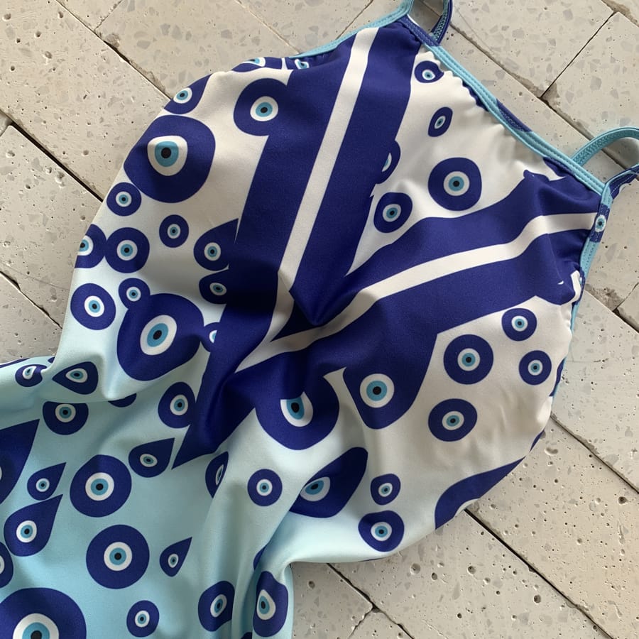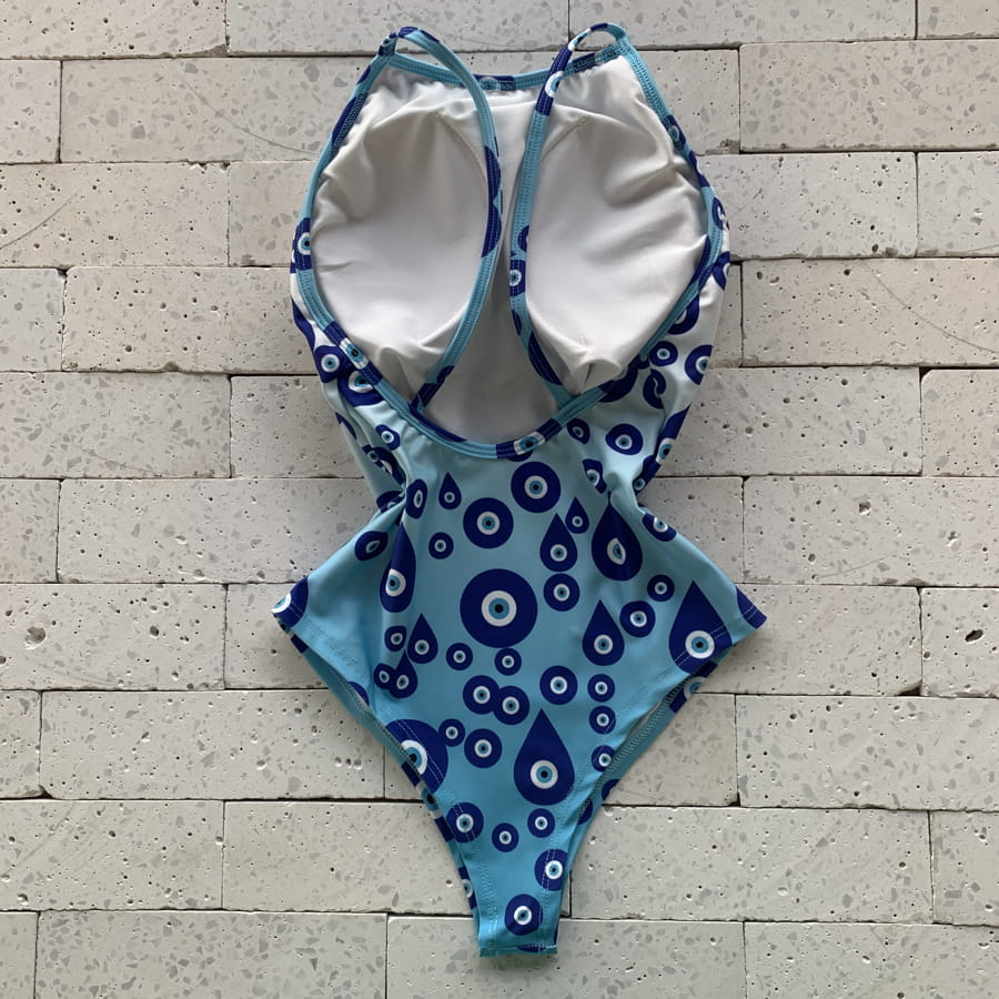 Body Maiô Com Bojo Costas Abertas Olho Grego Azul