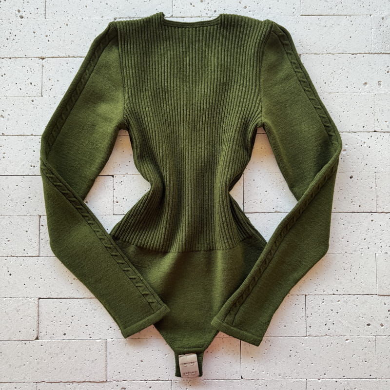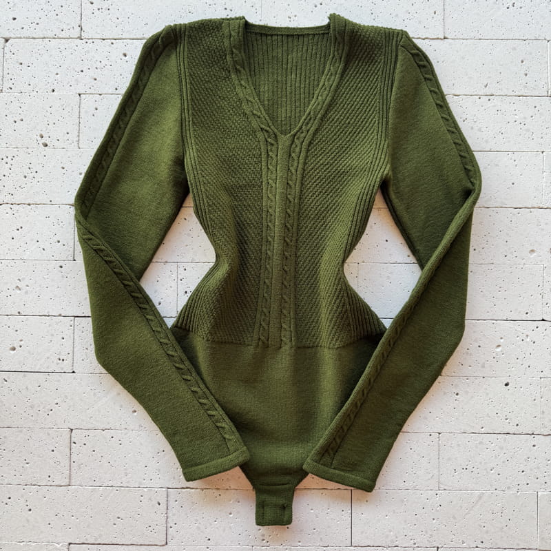 BODY MODAL DECOTE V E MANGA LONGA COM TRAMA FRONTAL VERDE OLIVA – Modelagem Ajustada e Trama Elegante