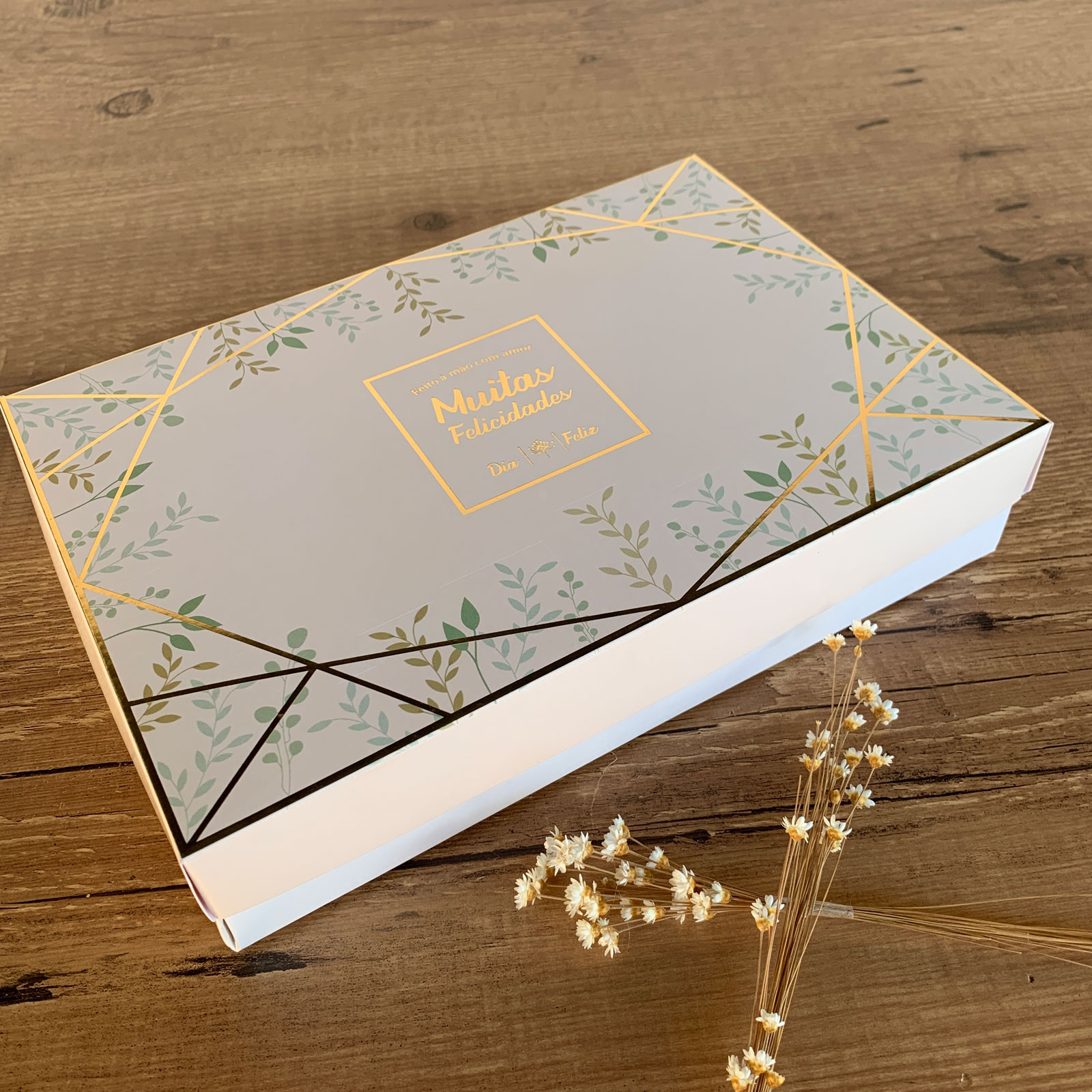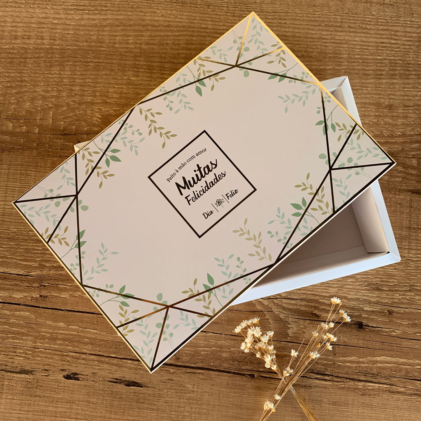 A Caixa de Presente Dia Das Mães torna a apresentação impecável e valoriza ainda mais os presentes! A montagem prática e fácil ficam por conta dos encaixes. A tampa personalizada com impressão de frase, folhagens e adornos dourados que incrementam o design da embalagem. A base e fundos em branco garantem a neutralidade, delicadeza inspirando equilíbrio, acolhimento e calma. Saiba que na hora de prestigiar quem você ama, a caixa personalizada para presente será um grande diferencial!