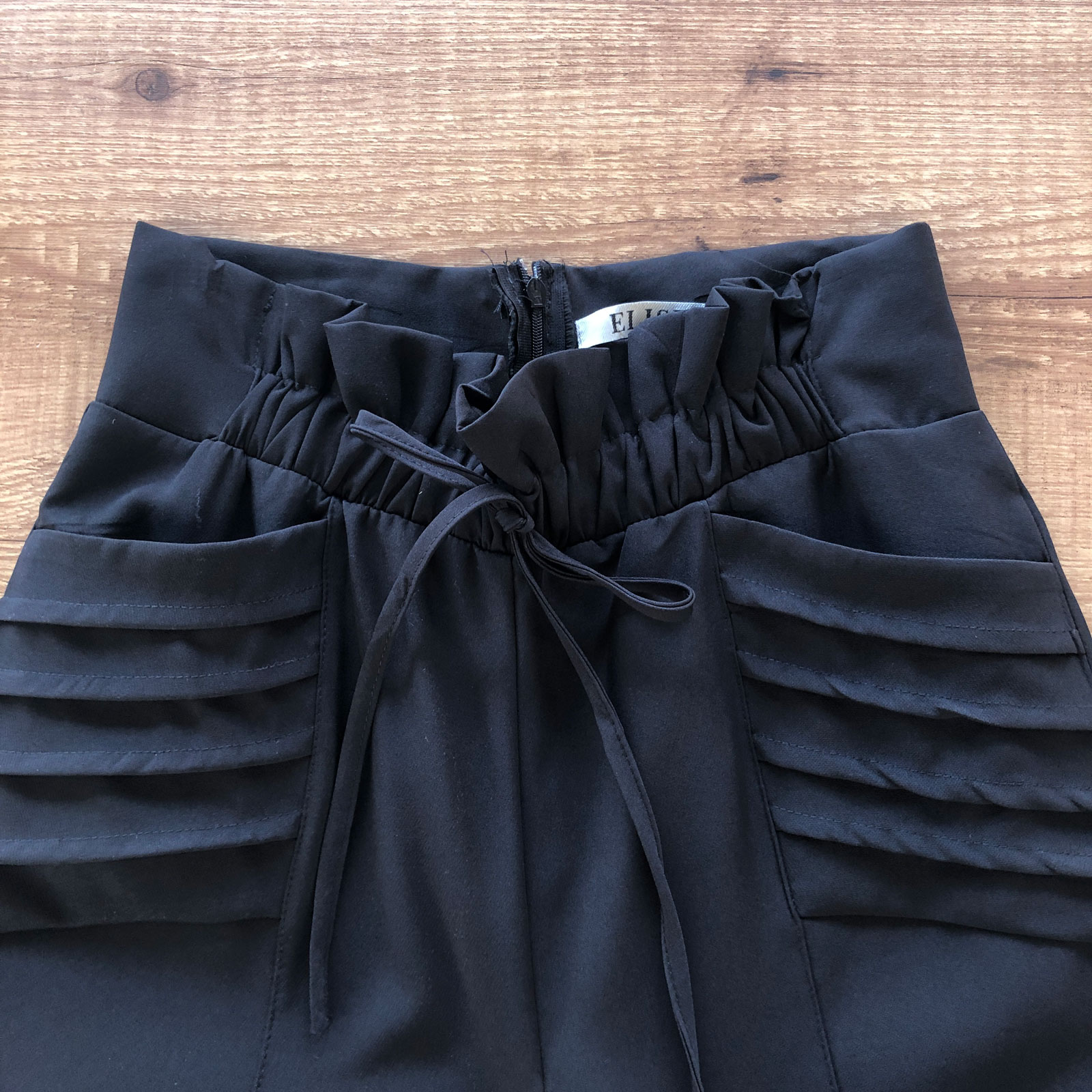 - Elástico na parte frontal da cintura com efeito drapeado;