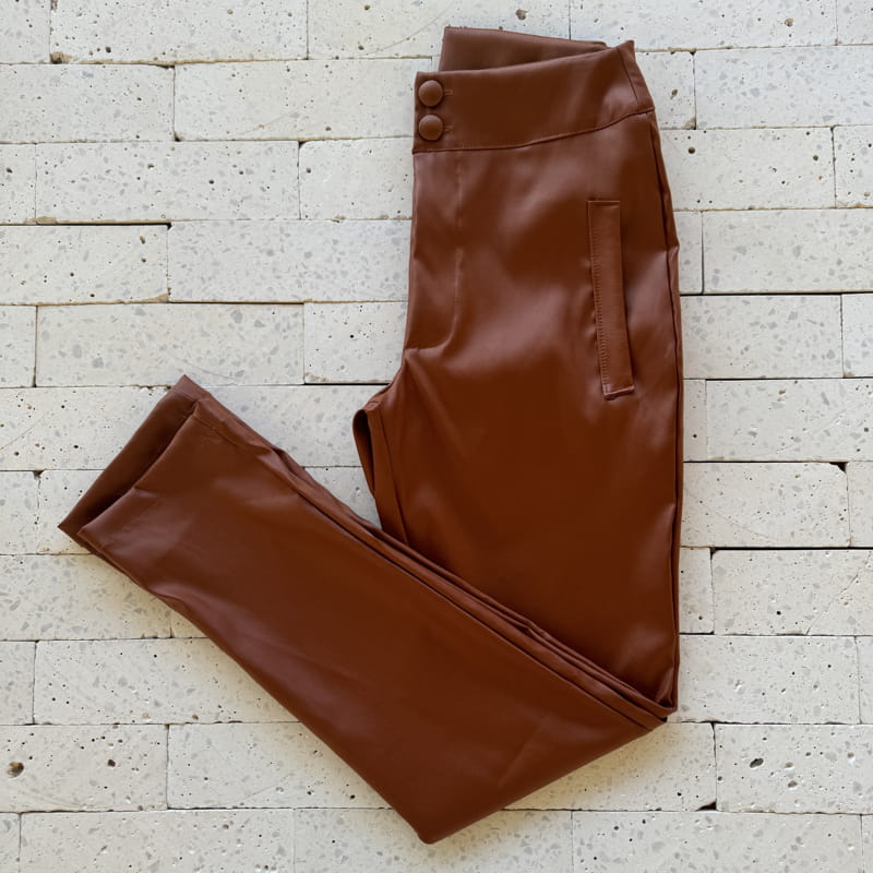 Escolha sua Calça de Couro Sintético com Bolso Fake Marrom com nosso PROVADOR VIRTUAL