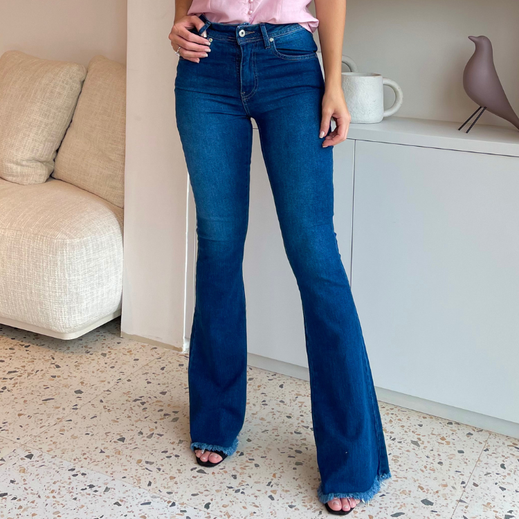 A calça jeans flare com barra desfiada carrega toda a sofisticação e beleza que um jeans deve ter! Peça marcada por ser tendência desde os anos 70 com o surgimento da “boca de sino”. Pode ser incorporada aos looks mais criativos e espontâneos. A combinação com camisas sociais, bodys e croppeds darão diferentes facetas ao visual. Acessórios em tons contrastantes mixados com sandálias de salto bloco serão boas composições para a sua finalização.