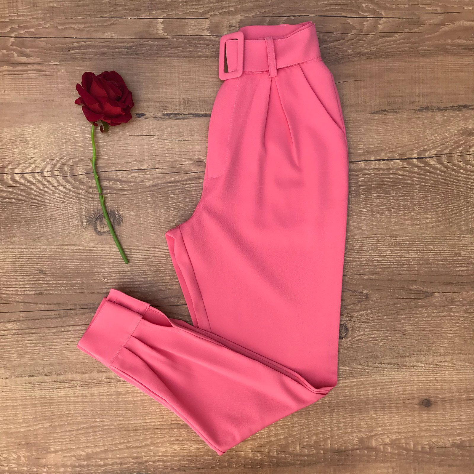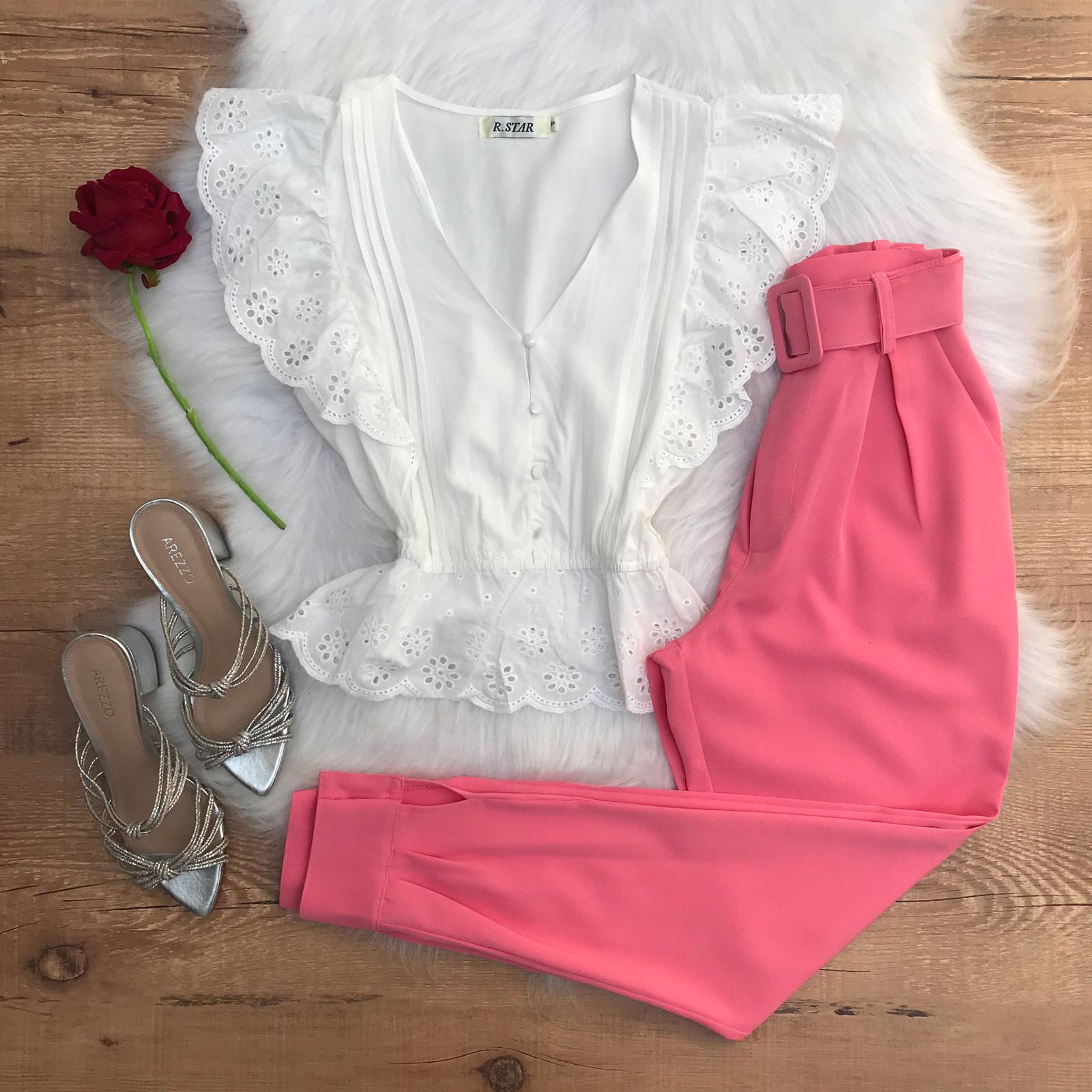 A Calça Jogger Alfaiataria Rosa Chiclete proporciona conforto e elegância. Há uma harmonização perfeita do casual do modelo jogger em contraste com a formalidade trazida pelo tecido alfaiataria. Esta calça conta com cós alto que possui passantes para cinto e acompanha cinto encapado na mesma cor da peça. Os vincos dianteiros e traseiros e o bolso frontal estilo faca reforçam este ar elegante. A peça também possui punho na barra com botões encapados e fechamento em zíper e botão frontal.