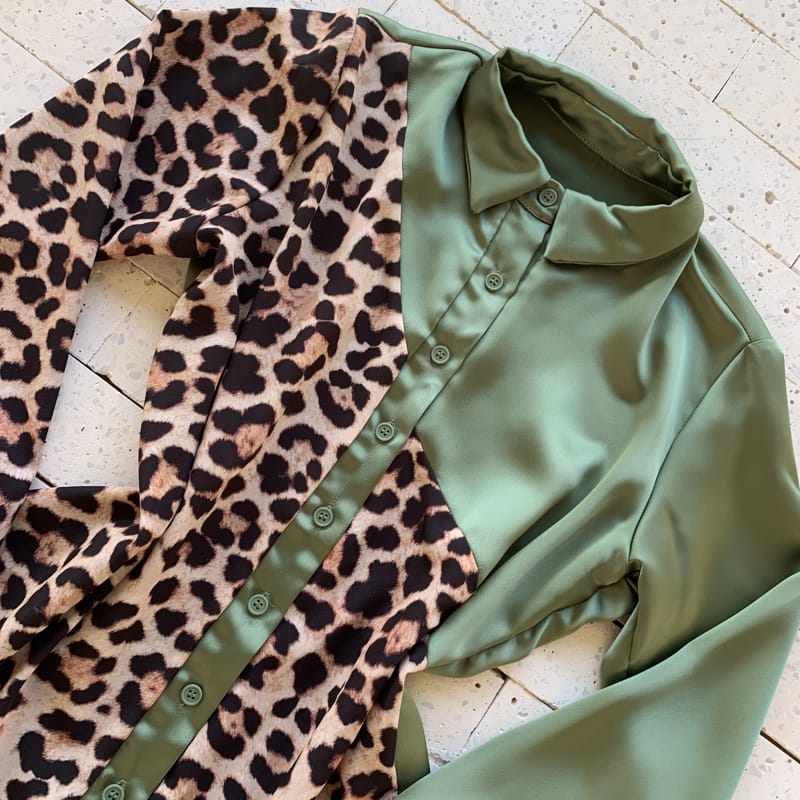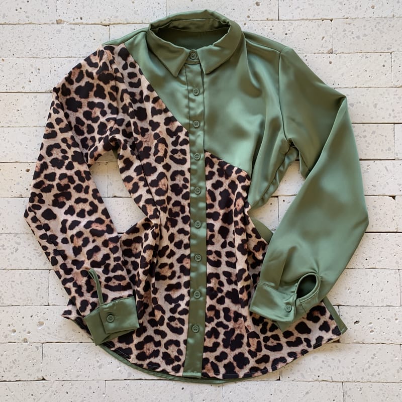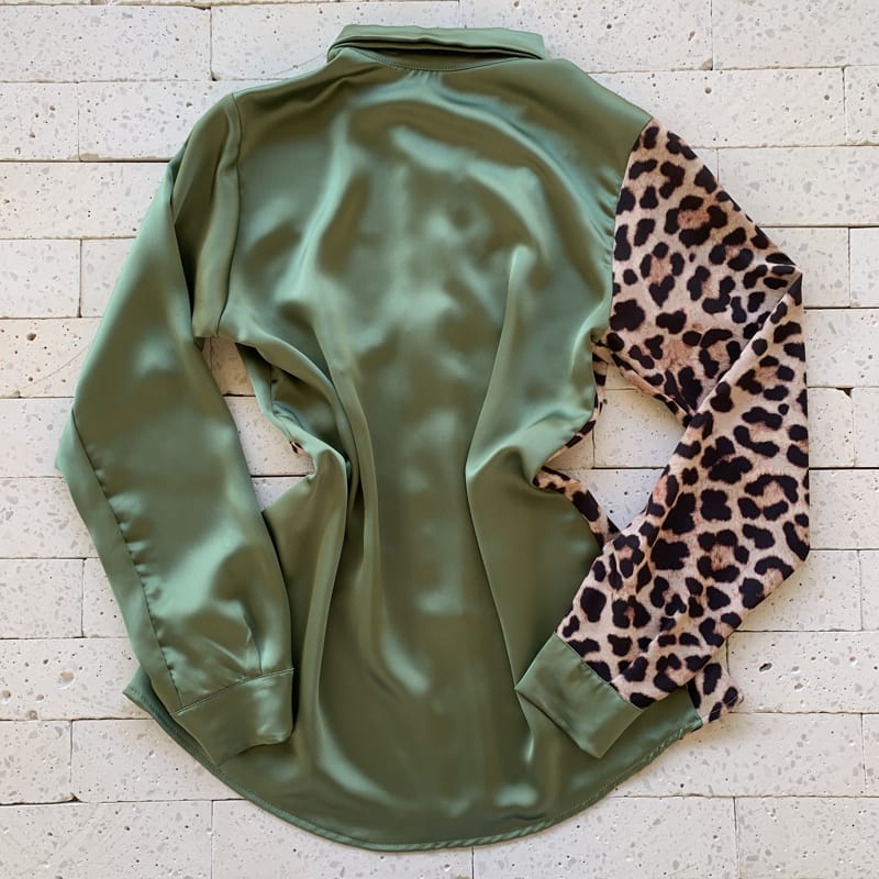 CAMISA ACETINADA COM ANIMAL PRINT VERDE MILITAR