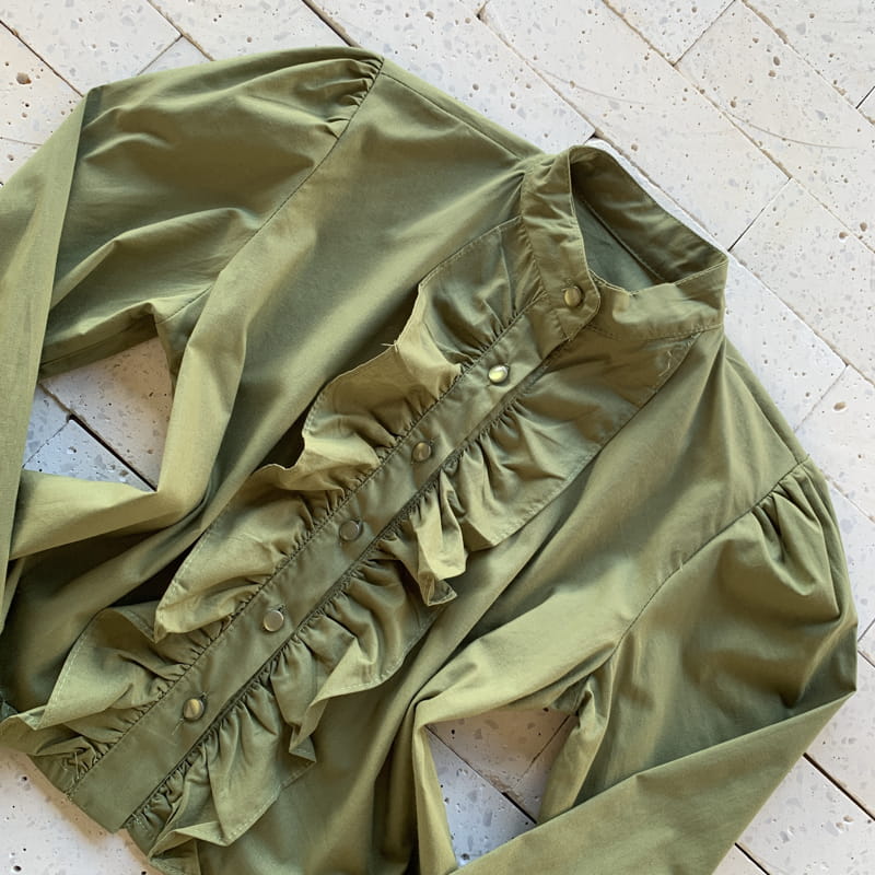 Destaque-se com a elegância e estilo da Camisa Cropped Com Babados Verde Militar da Dondoca. Então, compre agora mesmo e esteja sempre na moda!