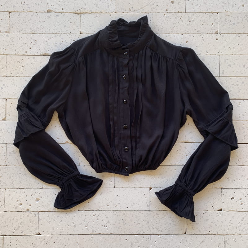 CAMISA CROPPED PREGAS E BABADOS NA MANGA LUXO PRETA