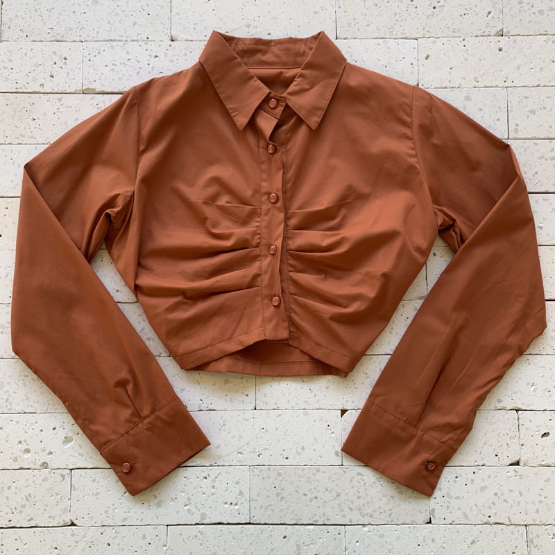 CAMISA CROPPED PREGAS LUXO TELHA – Dondoca