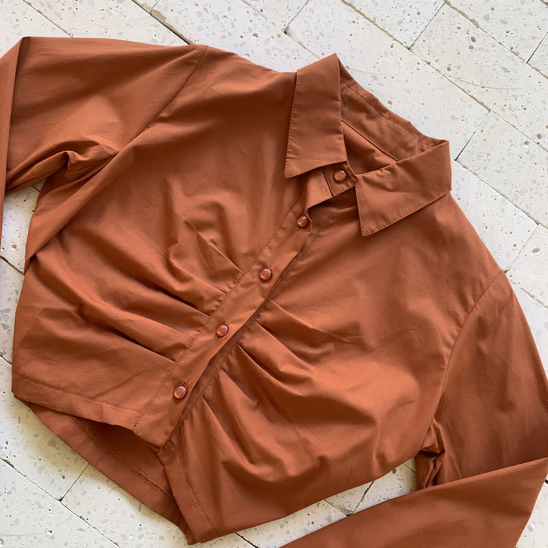 A camisa é confeccionada em tecido de alta qualidade e com uma tonalidade de telha que dá um toque de elegância e requinte. Assim, as pregas na parte frontal conferem um charme extra à peça, tornando-a ainda mais desejável.