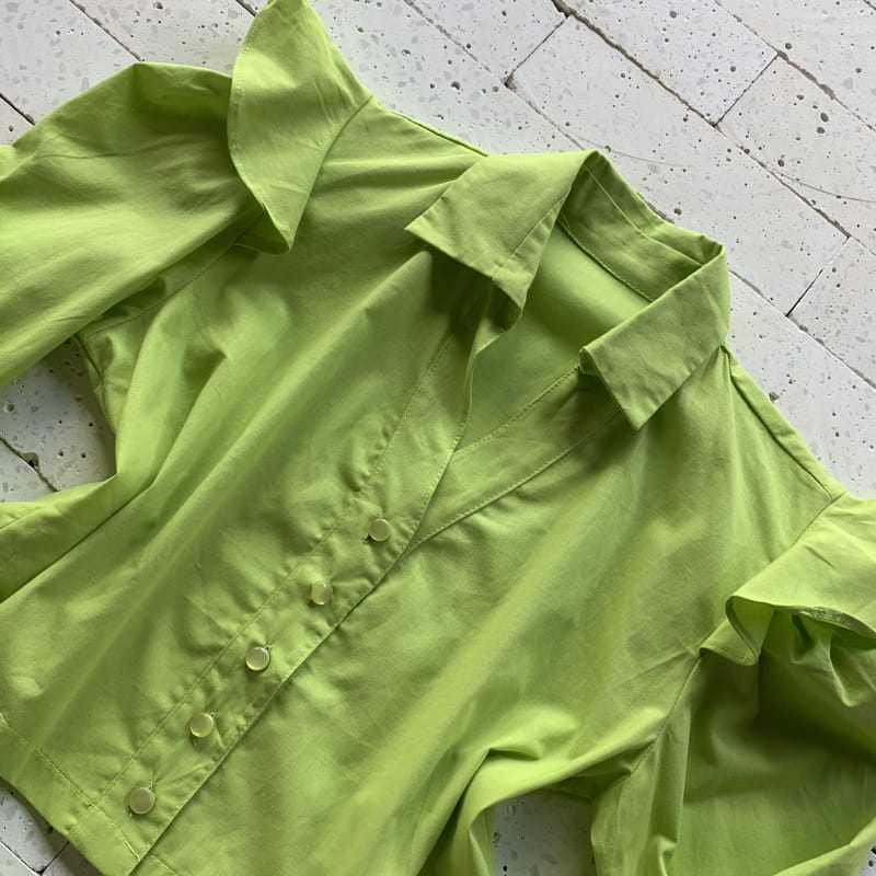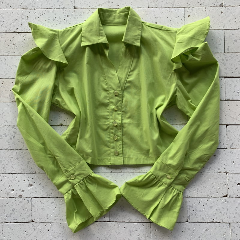 A Camisa Cropped Tricoline com Babados no Ombro Verde Limão é peça curinga para composições requintadas! O tecido tricoline em que a peça é confeccionada garante um caimento estruturado e uma aparência profissional super elegante, além disso, as fibras permitem que a peça seja leve e tenha ótima respirabilidade.
