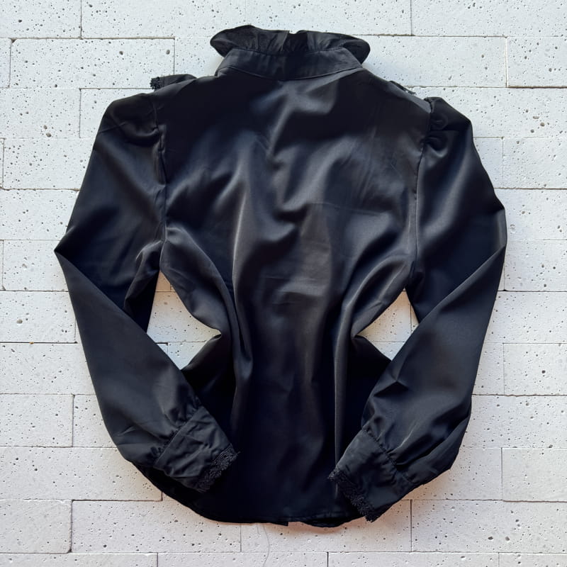 CAMISA FEMININA CREPE BABADOS COM GRIPIER LUXO PRETA – Elegância Atemporal com Detalhes Sofisticados
