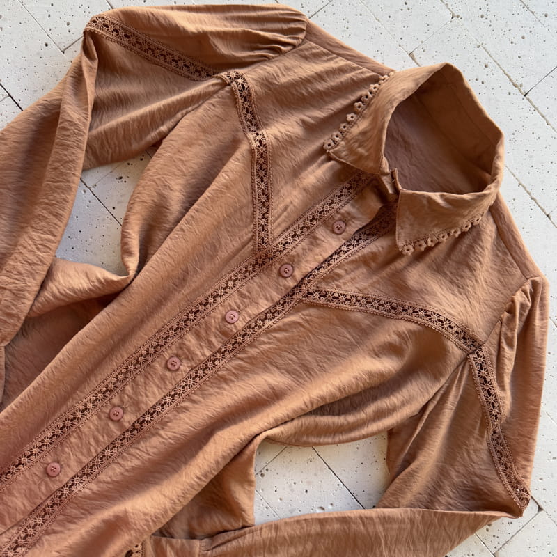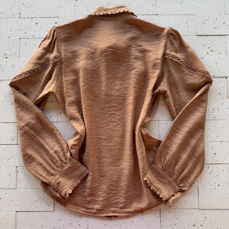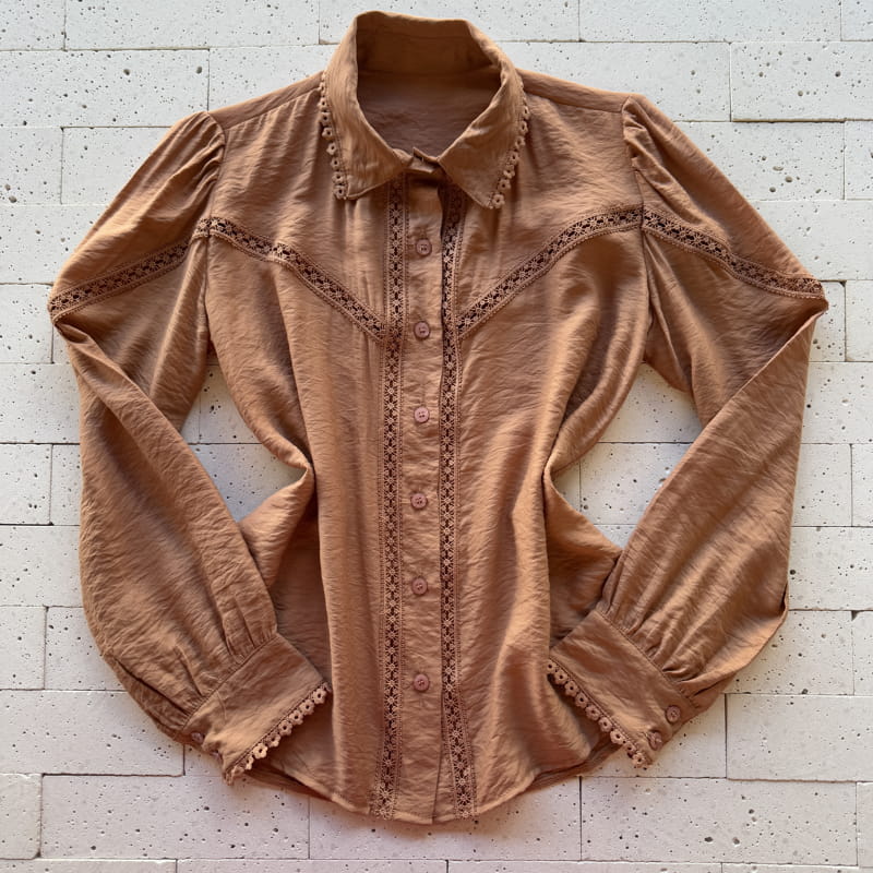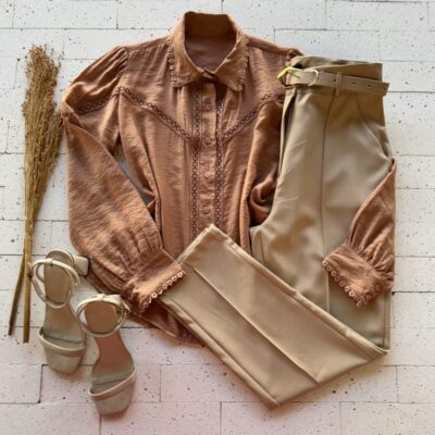 A **Camisa Feminina Detalhada com Gripier Frontal Gola e Punho Nude** é a escolha perfeita para quem busca um visual elegante e sofisticado. Feita em um tecido macio de viscose com poliamida, proporciona um toque suave e conforto para o dia a dia. Seu design refinado conta com aplicações em gripier ao longo da parte frontal e nos punhos, além de uma gola clássica com detalhes delicados, conferindo um charme extra à peça. Com mangas longas levemente bufantes e fechamento por botões encapados, essa camisa é ideal para compor looks versáteis e atemporais.