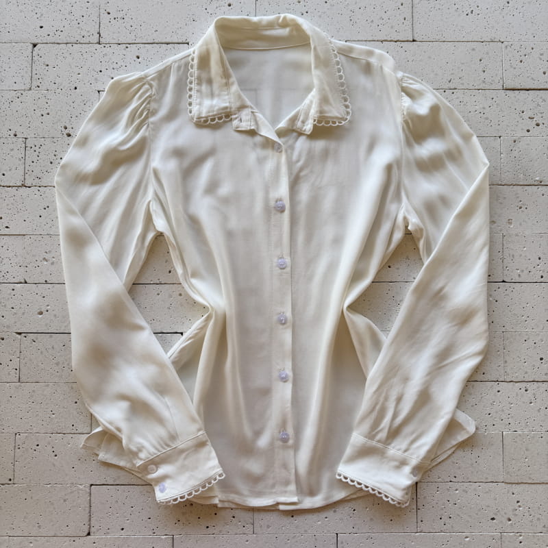 A camisa feminina off white com gola e punho em renda delicada é a peça perfeita para compor looks refinados e atemporais. Com tecido leve de viscose, caimento solto e toque macio, ela combina romantismo com sofisticação. Os detalhes vazados na gola e punhos trazem um charme especial à peça, enquanto os botões frontais e a modelagem com leve franzido nos ombros valorizam a silhueta feminina de forma sutil.