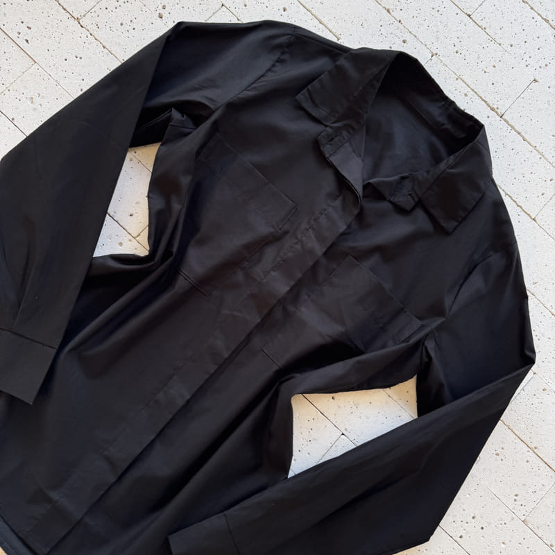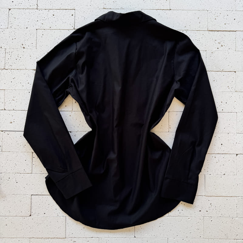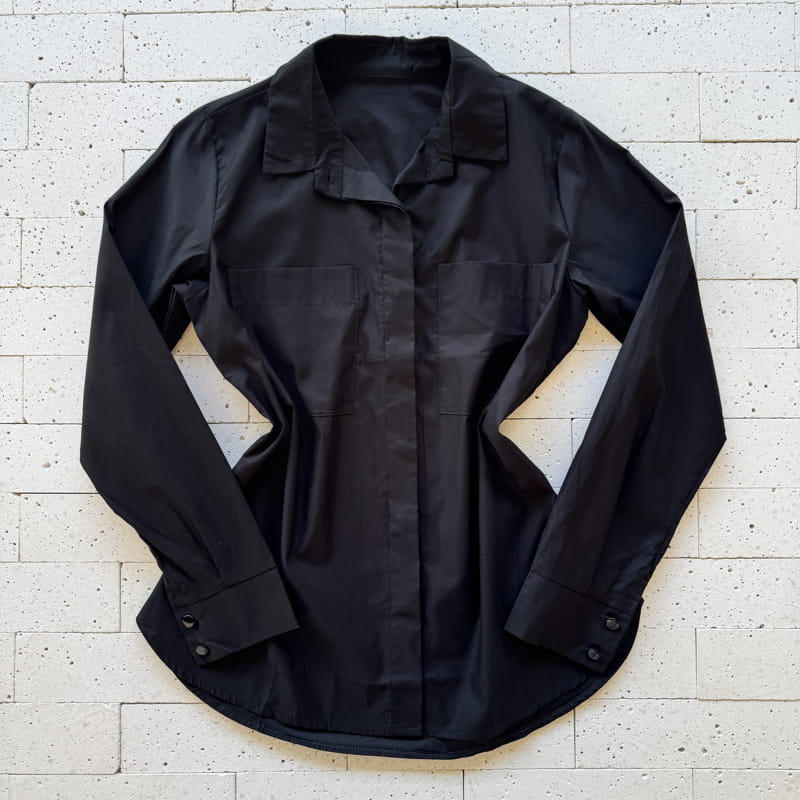 CAMISA FEMININA TRICOLINE ALONGADA COM BOLSOS FRONTAIS PRETO – Elegância Atemporal em Alfaiataria