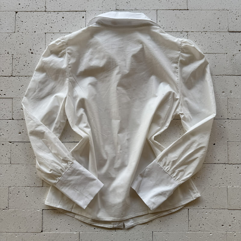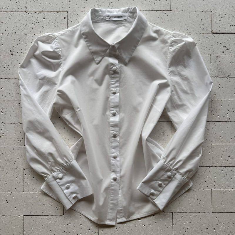 - Mangas com volume sutil e punhos amplos com botões encapados