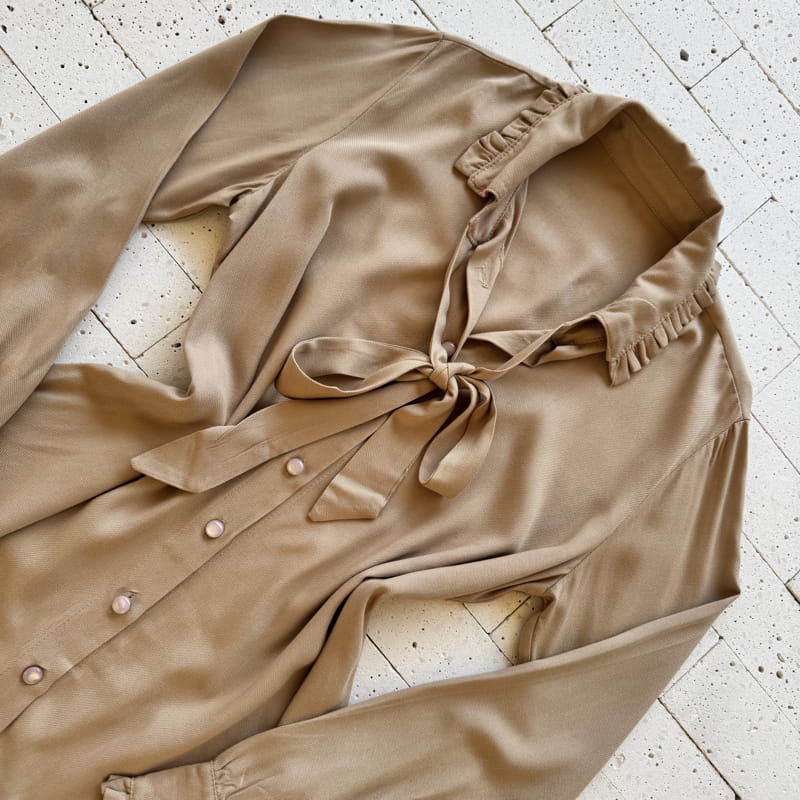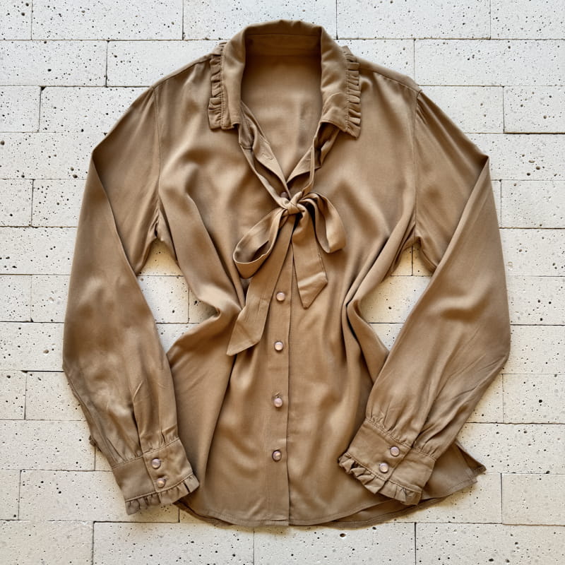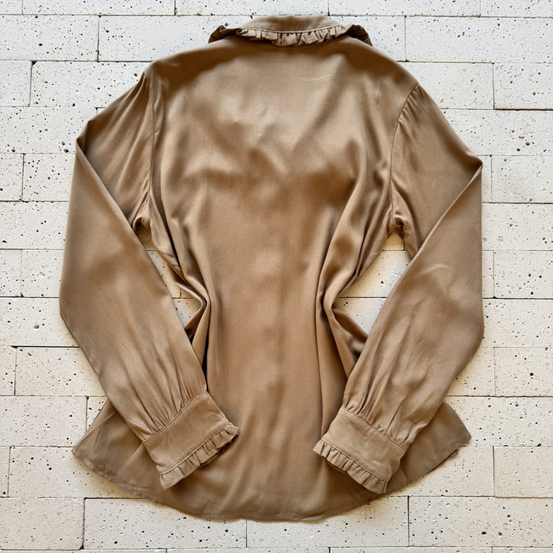 CAMISA SOCIAL GOLA E PUNHO BABADINHOS E AMARRAÇÃO LUXO BEGE – Delicadeza e Sofisticação