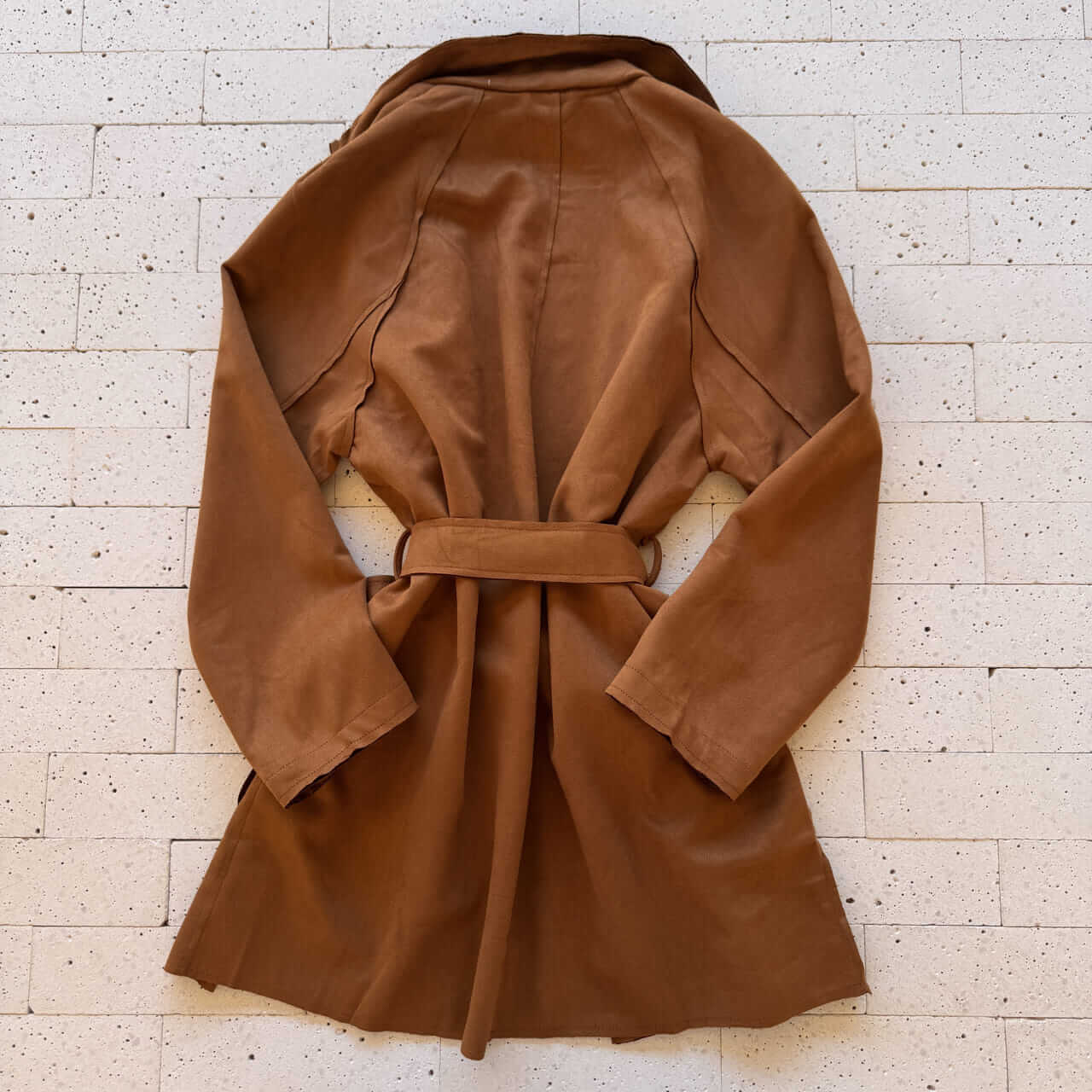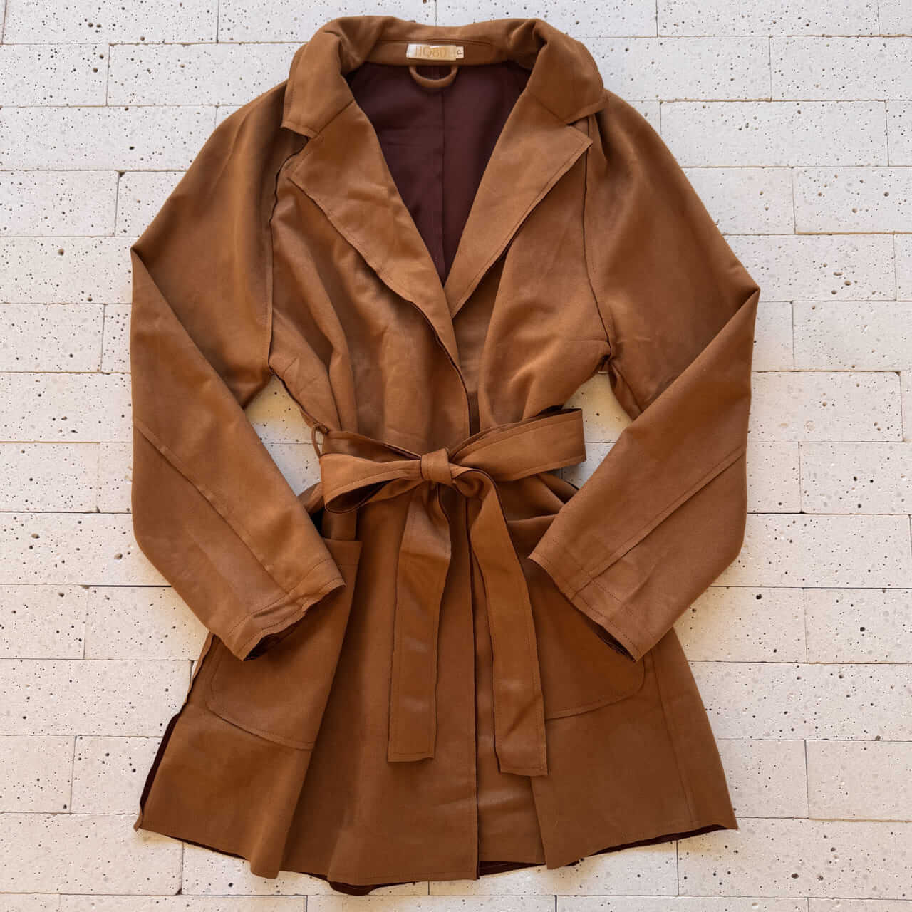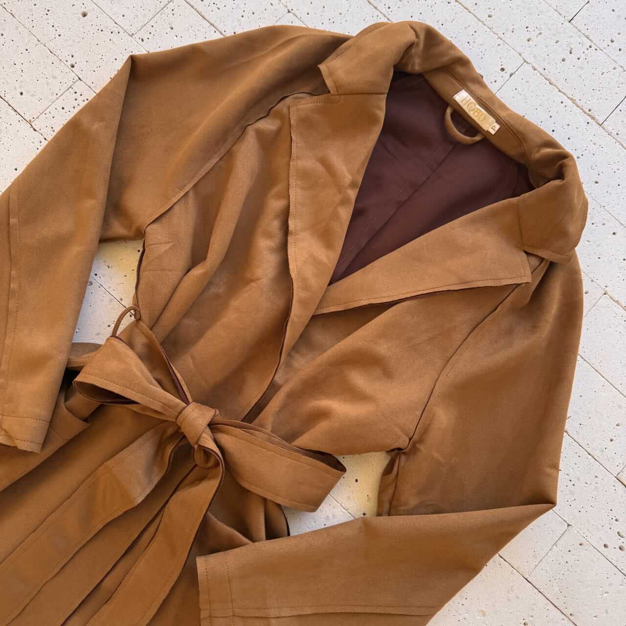 Casaco Alongado Suede com Bolsos e Cinto Faixa Caramelo – Charme Elegante e Toque Macio