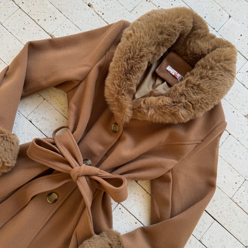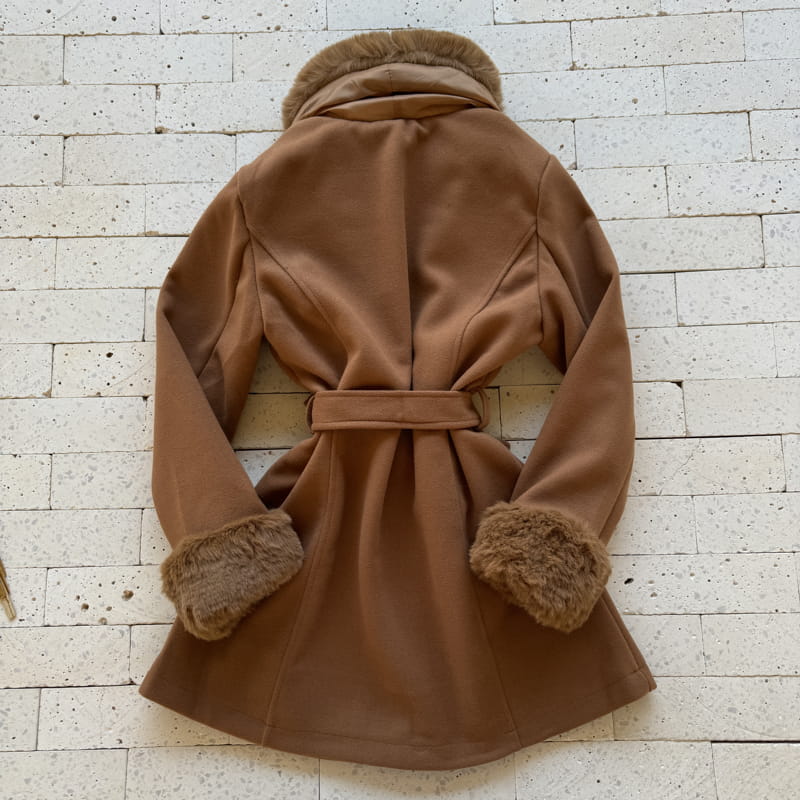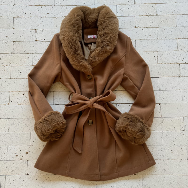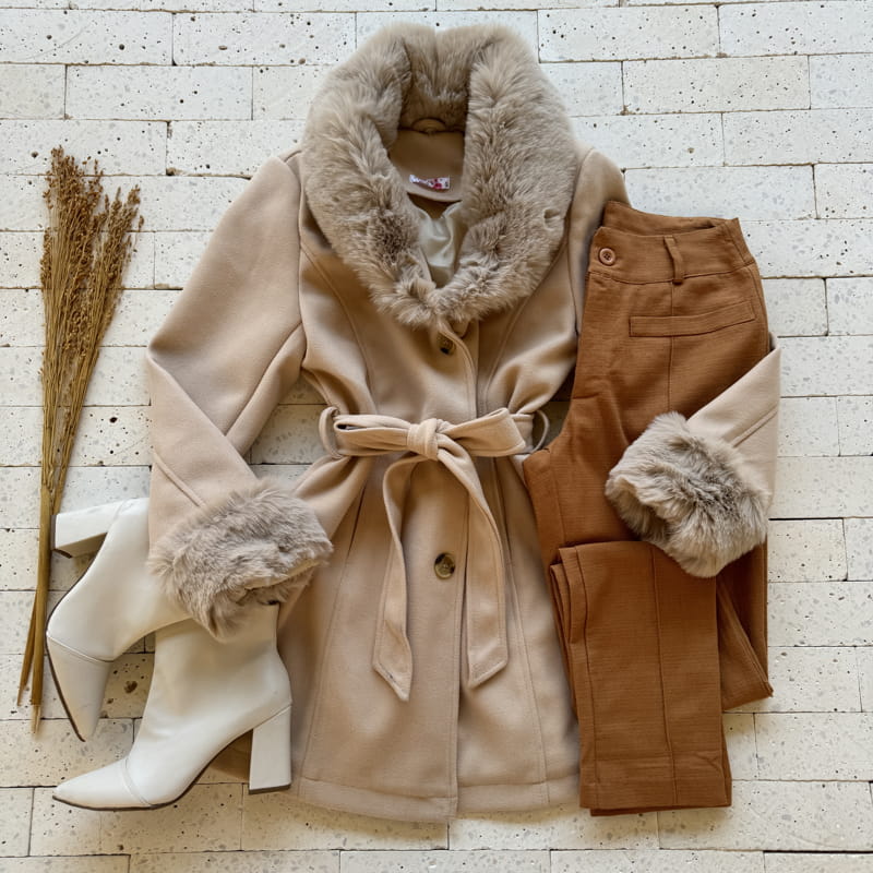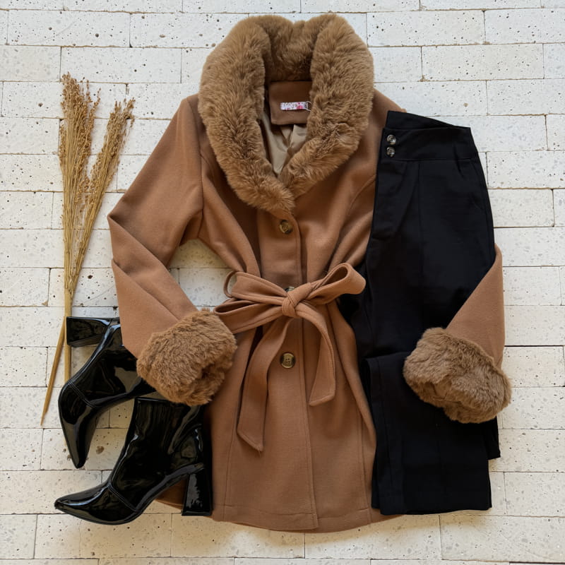 CASACO FEMININO COM PELO NA GOLA E PUNHO LUXO MARROM