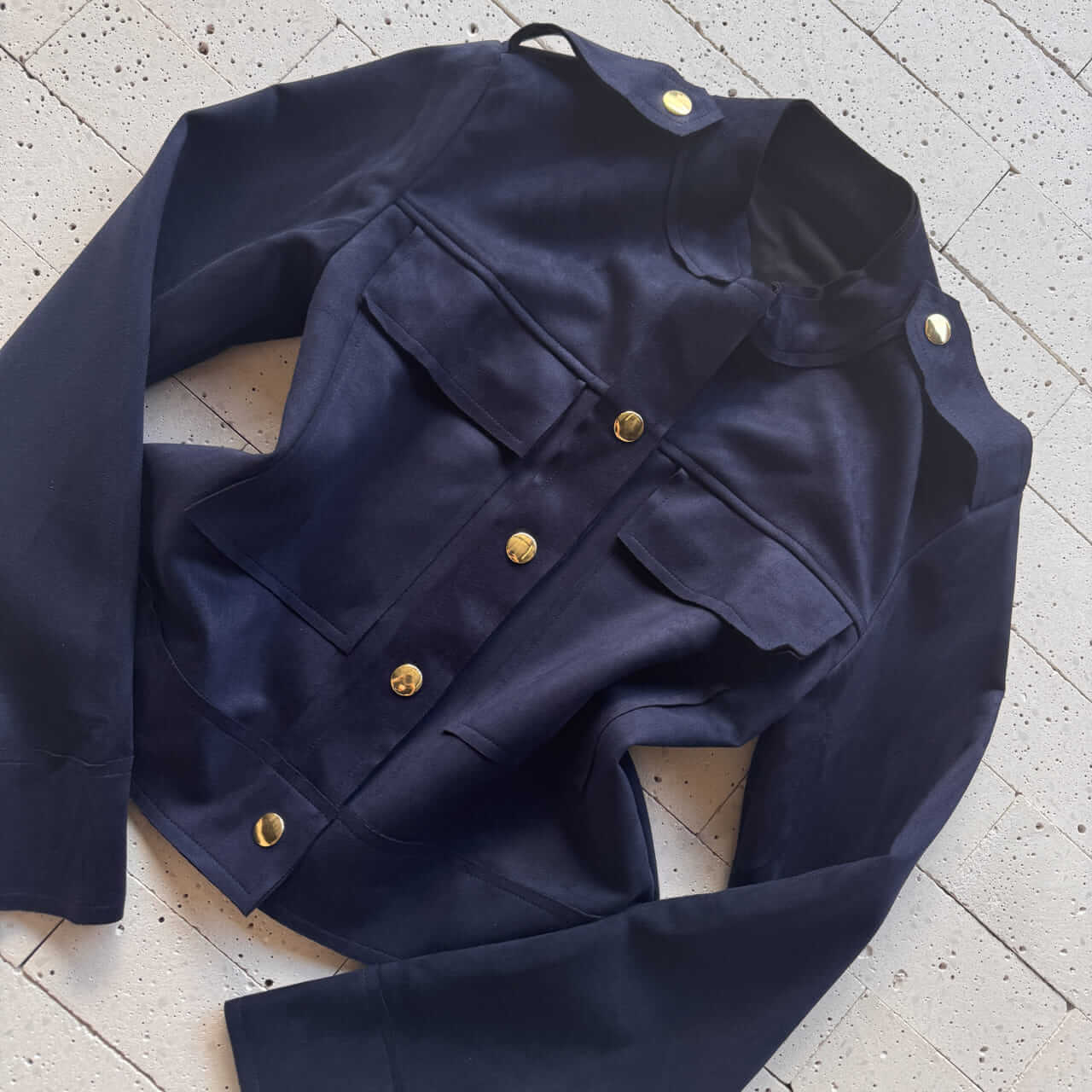 Casaco Suede Detalhe Bolsos e Botões Marinho – Elegância Clássica com Toque Contemporâneo