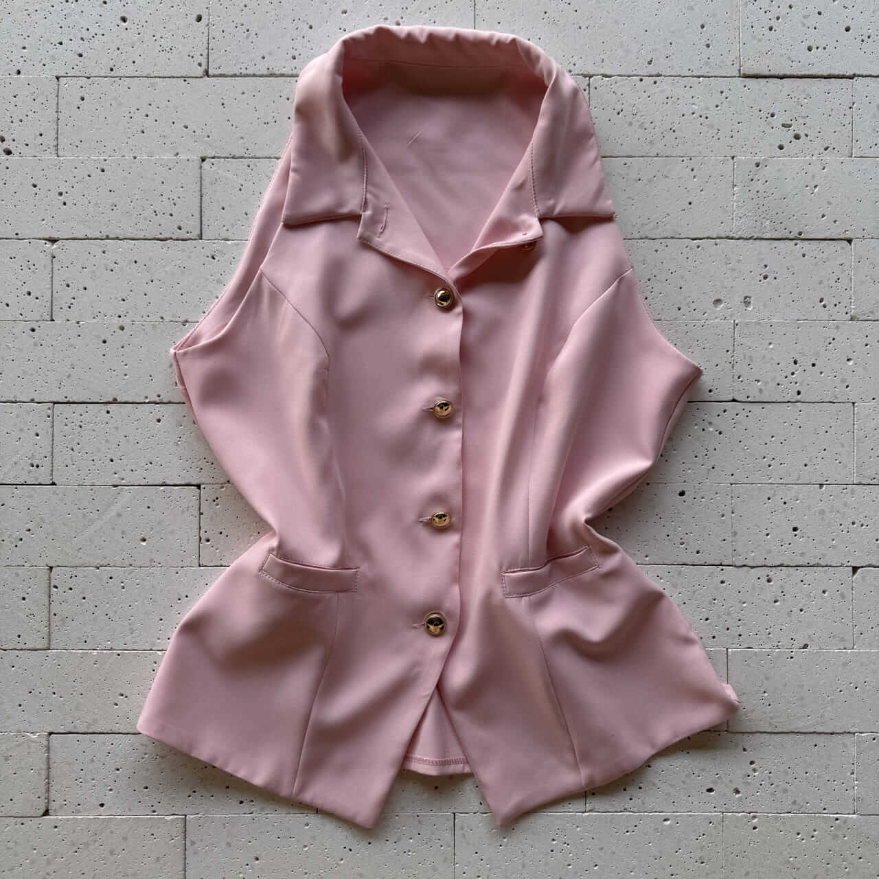 Conforto e sofisticação se encontram neste conjunto de alfaiataria em tom rosa suave. A blusa apresenta modelagem acinturada sem mangas, com gola dobrada e fechamento frontal por botões dourados que adicionam charme e sofisticação. O short de cintura alta complementa o visual com caimento fluido e cós estruturado com botão dourado, além de passantes para cinto e bolsos funcionais. Ideal para compor looks elegantes e versáteis, tanto para o dia quanto para a noite.