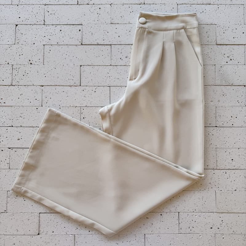 CONJUNTO ALFAIATARIA CROPPED BOHO E CALÇA PANTALONA BEGE – Elegância Neutra & Movimento Fluido
