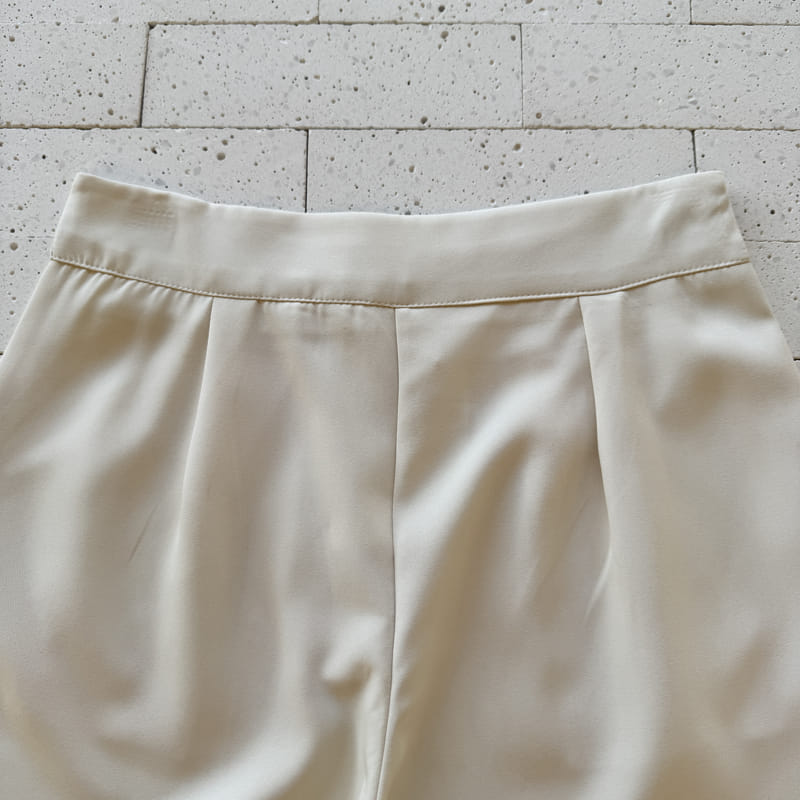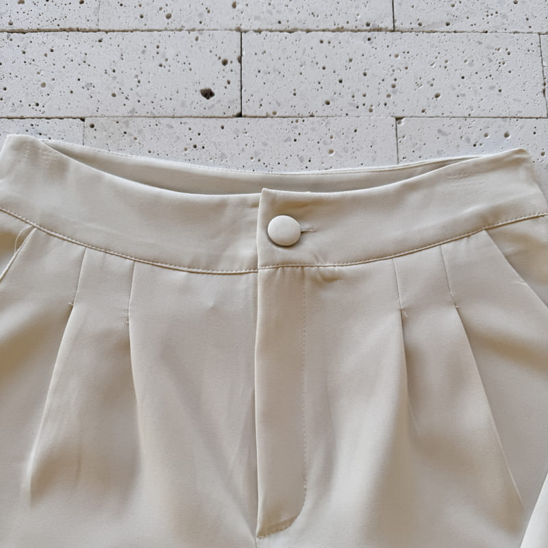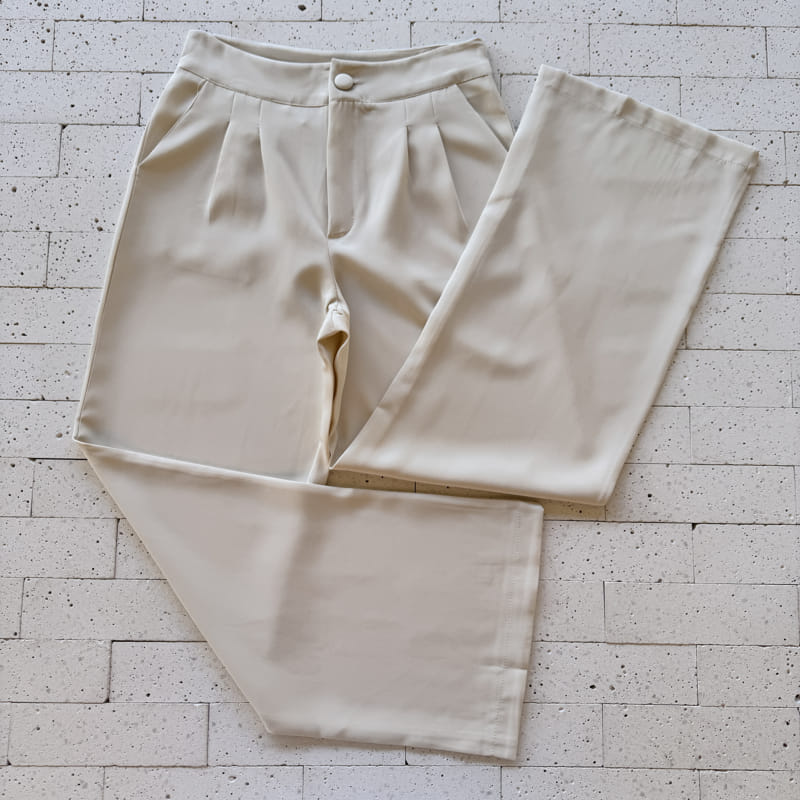 - Calça pantalona de alfaiataria, cós médio com botão forrado e zíper embutido