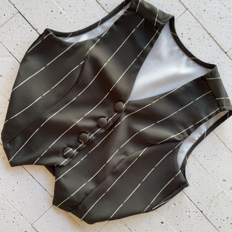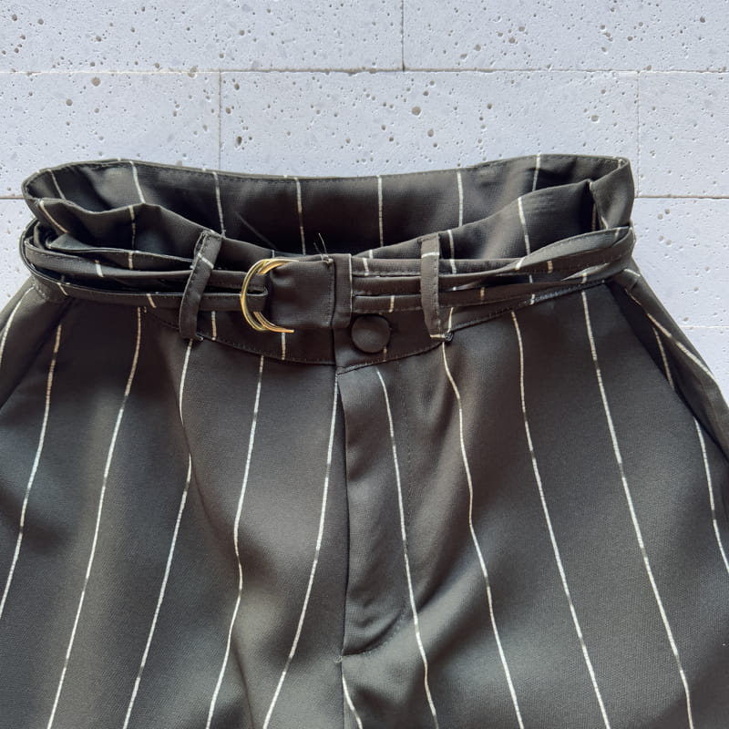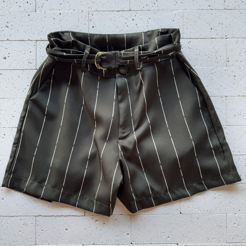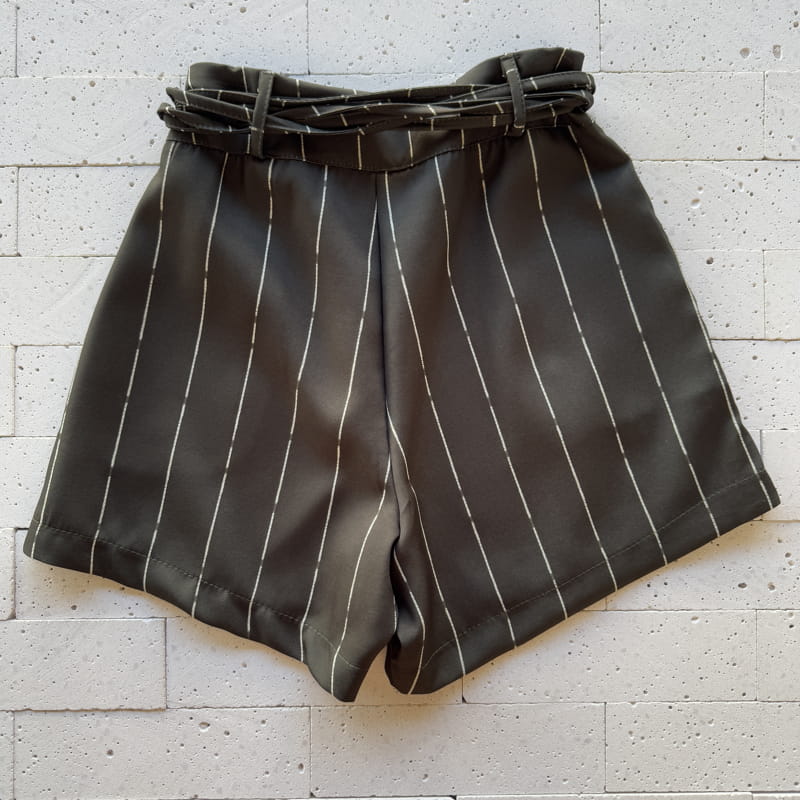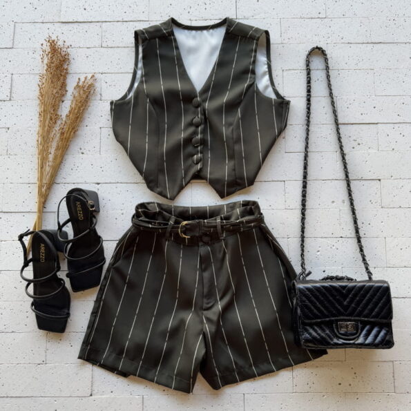 CONJUNTO ALFAIATARIA LISTRADO CROPPED COLETE E SHORT COM CINTO VERDE OLIVA – Sofisticação e Modernidade